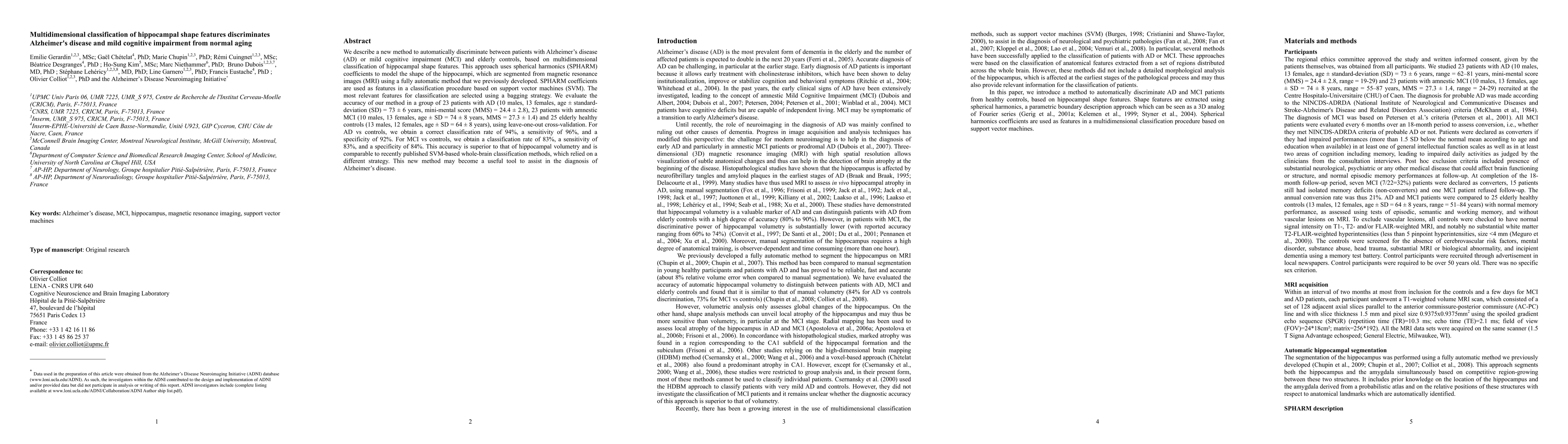 This paper introduces a novel method using multidimensional classification of hippocampal shape features, modeled via spherical harmonics, to distinguish Alzheimer's disease and mild cognitive impairment from normal aging. The method achieves high classification accuracy, outperforming hippocampal volumetry and showing promise as a diagnostic tool.
