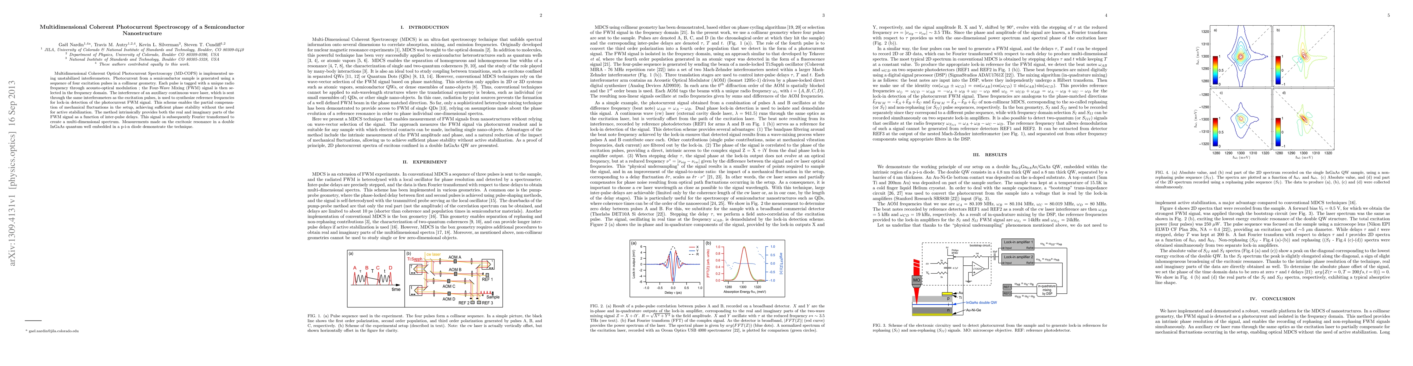 This paper introduces Multidimensional Coherent Optical Photocurrent Spectroscopy (MD-COPS) using unstabilized interferometers to study semiconductor nanostructures. The method generates photocurrent via four excitation pulses, enabling Fourier transformation to create a multi-dimensional spectrum, demonstrating its application on excitonic resonance in a double InGaAs quantum well.