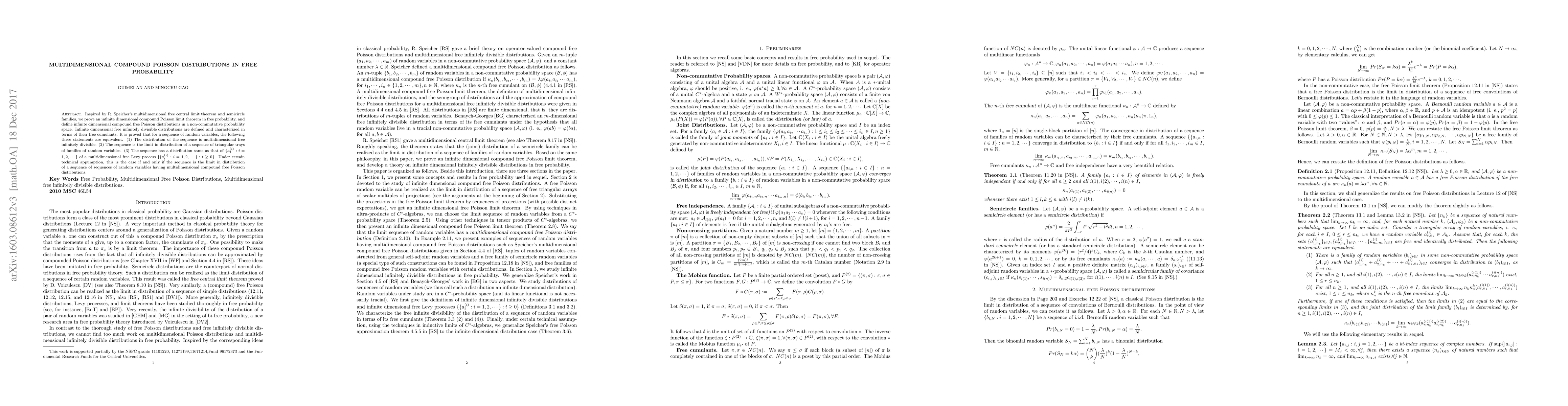 This paper proves an infinite-dimensional compound Poisson limit theorem in free probability, defining multidimensional free Poisson distributions and characterizing free infinitely divisible distributions via their free cumulants. It establishes equivalences between various forms of multidimensional free infinitely divisible distributions.