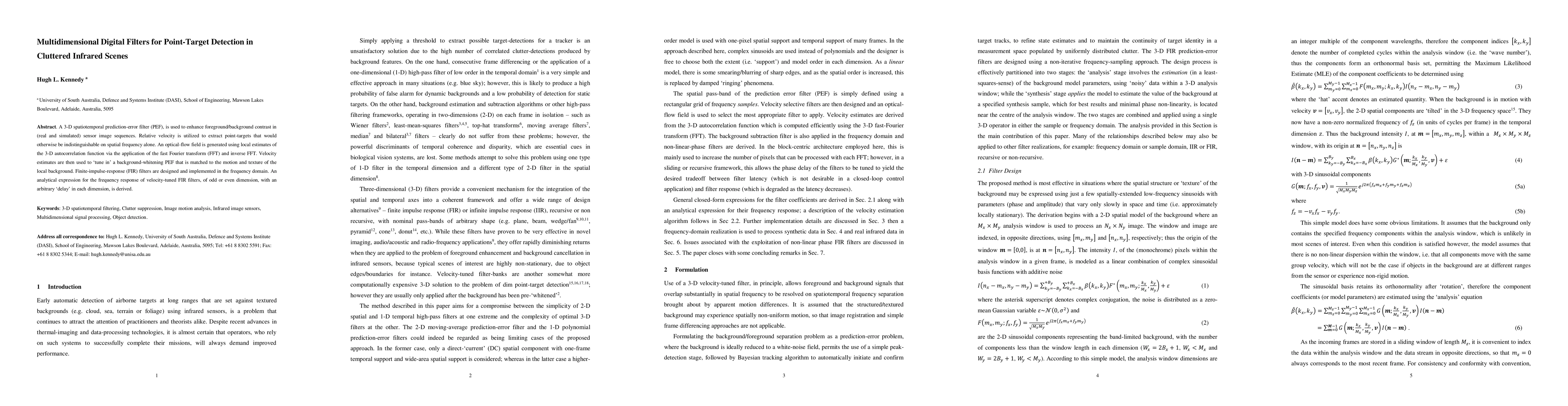 A 3-D spatiotemporal prediction-error filter (PEF), is used to enhance foreground/background contrast in (real and simulated) sensor image sequences. Relative velocity is utilized to extract point-targets that would otherwise be indistinguishable on spatial frequency alone. An optical-flow field is generated using local estimates of the 3-D autocorrelation function via the application of the fast Fourier transform (FFT) and inverse FFT. Velocity estimates are then used to tune in a background-whitening PEF that is matched to the motion and texture of the local background. Finite-impulse-response (FIR) filters are designed and implemented in the frequency domain. An analytical expression for the frequency response of velocity-tuned FIR filters, of odd or even dimension, with an arbitrary delay in each dimension, is derived.