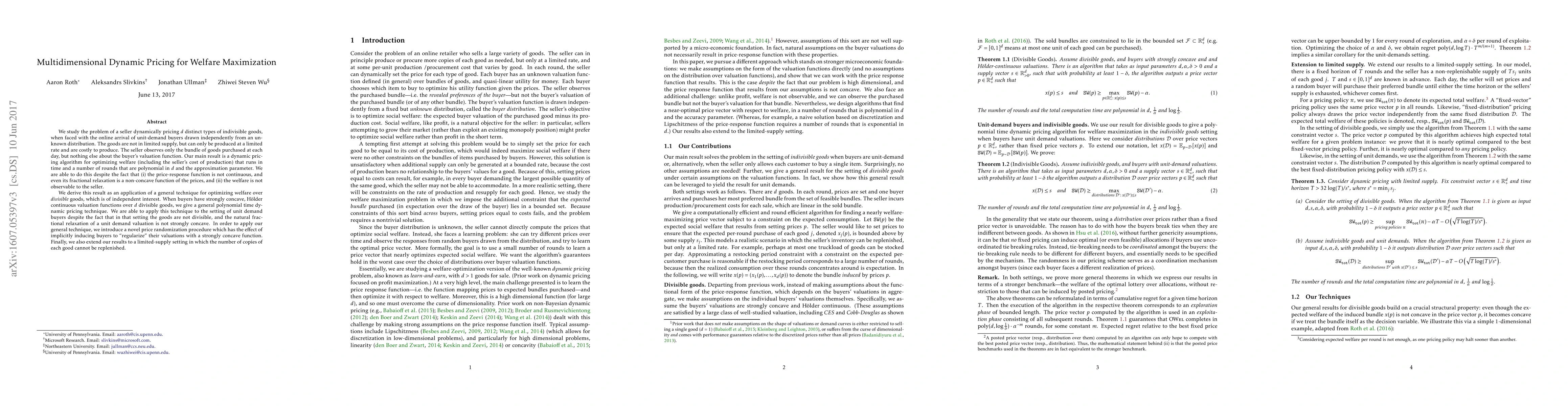 We study the problem of a seller dynamically pricing $d$ distinct types of indivisible goods, when faced with the online arrival of unit-demand buyers drawn independently from an unknown distribution. The goods are not in limited supply, but can only be produced at a limited rate and are costly to produce. The seller observes only the bundle of goods purchased at each day, but nothing else about the buyer's valuation function. Our main result is a dynamic pricing algorithm for optimizing welfare (including the seller's cost of production) that runs in time and a number of rounds that are polynomial in $d$ and the approximation parameter. We are able to do this despite the fact that (i) the price-response function is not continuous, and even its fractional relaxation is a non-concave function of the prices, and (ii) the welfare is not observable to the seller. We derive this result as an application of a general technique for optimizing welfare over \emph{divisible} goods, which is of independent interest. When buyers have strongly concave, H\"older continuous valuation functions over $d$ divisible goods, we give a general polynomial time dynamic pricing technique. We are able to apply this technique to the setting of unit demand buyers despite the fact that in that setting the goods are not divisible, and the natural fractional relaxation of a unit demand valuation is not strongly concave. In order to apply our general technique, we introduce a novel price randomization procedure which has the effect of implicitly inducing buyers to "regularize" their valuations with a strongly concave function. Finally, we also extend our results to a limited-supply setting in which the number of copies of each good cannot be replenished.