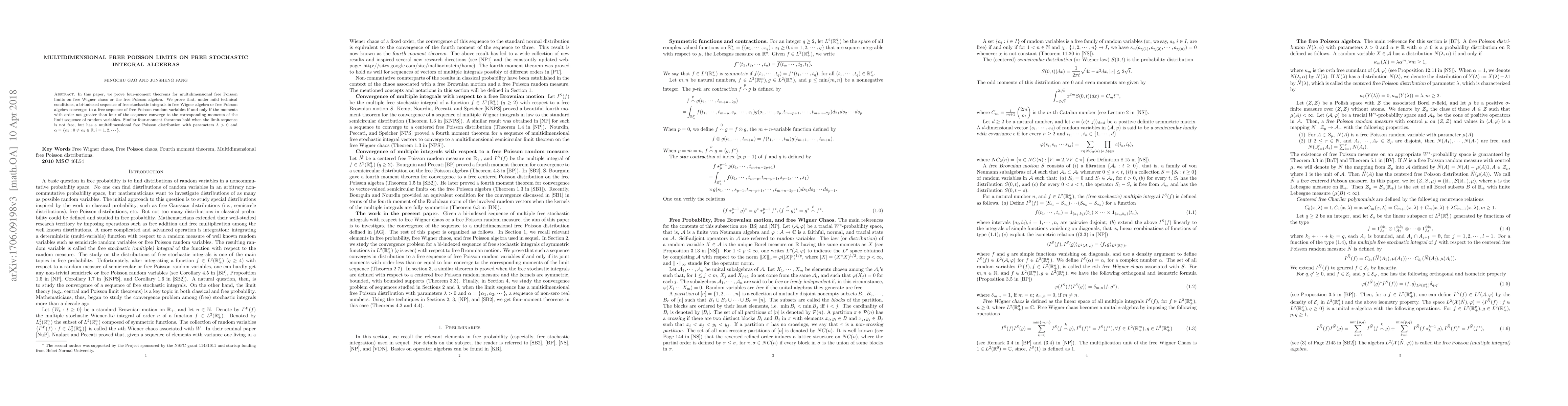 This paper establishes four-moment theorems for multidimensional free Poisson limits in free stochastic integral algebras, showing that convergence of moments up to order four is sufficient for convergence to a free Poisson sequence. It also extends these results to sequences with a multidimensional free Poisson distribution.