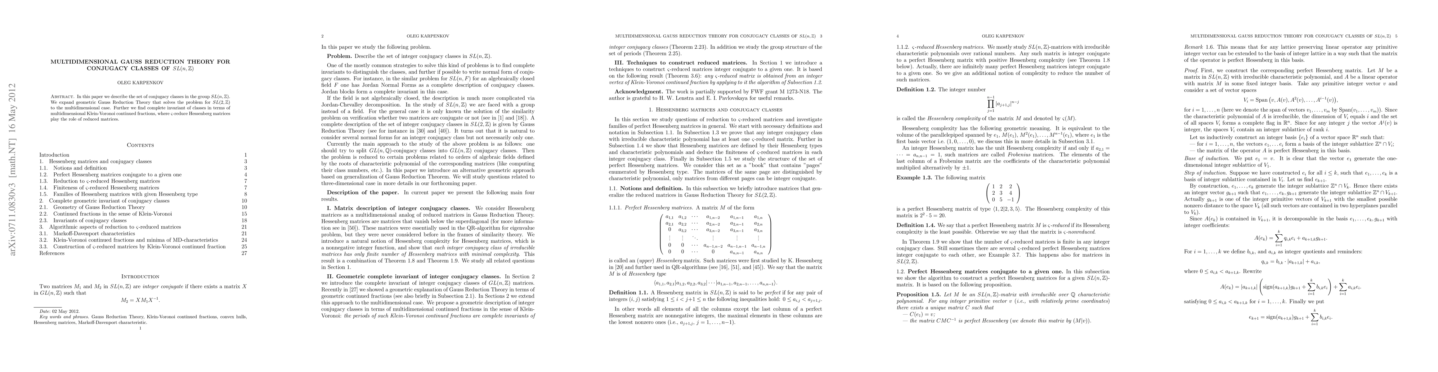 In this paper we describe the set of conjugacy classes in the group SL(n,Z). We expand geometric Gauss Reduction Theory that solves the problem for SL(2,Z) to the multidimensional case. Further we find complete invariant of classes in terms of multidimensional Klein-Voronoi continued fractions, where $\varsigma$-reduce Hessenberg matrices play the role of reduced matrices.