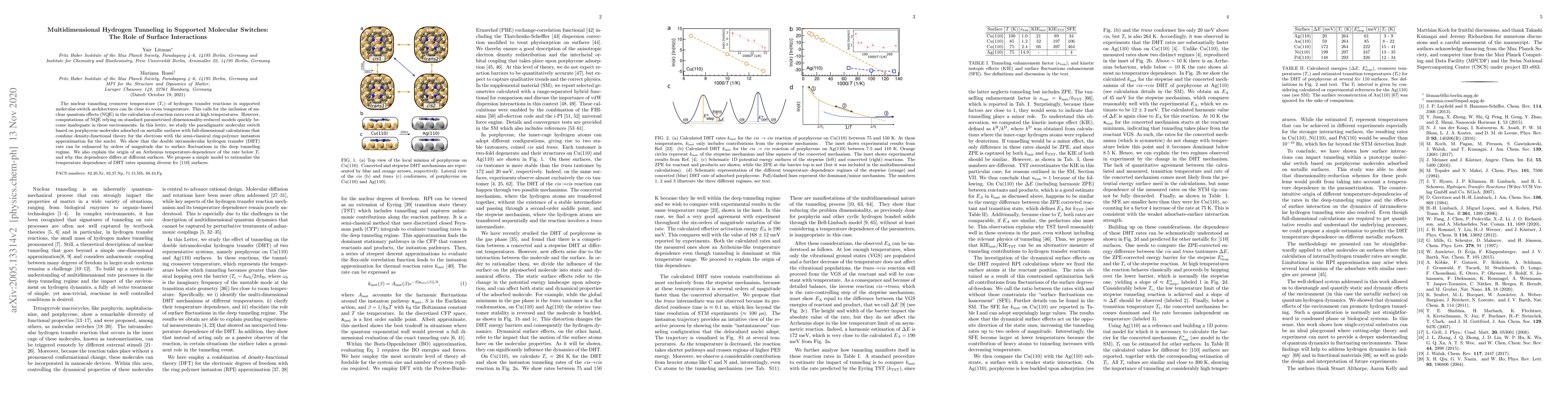This paper investigates the nuclear quantum effects (NQE) in hydrogen transfer reactions within supported molecular-switch architectures, demonstrating that surface interactions significantly enhance the double intramolecular hydrogen transfer (DHT) rate through full-dimensional calculations. The study reveals the importance of considering NQE even at room temperature and provides a model to explain the differing Arrhenius temperature dependence across various metallic surfaces.