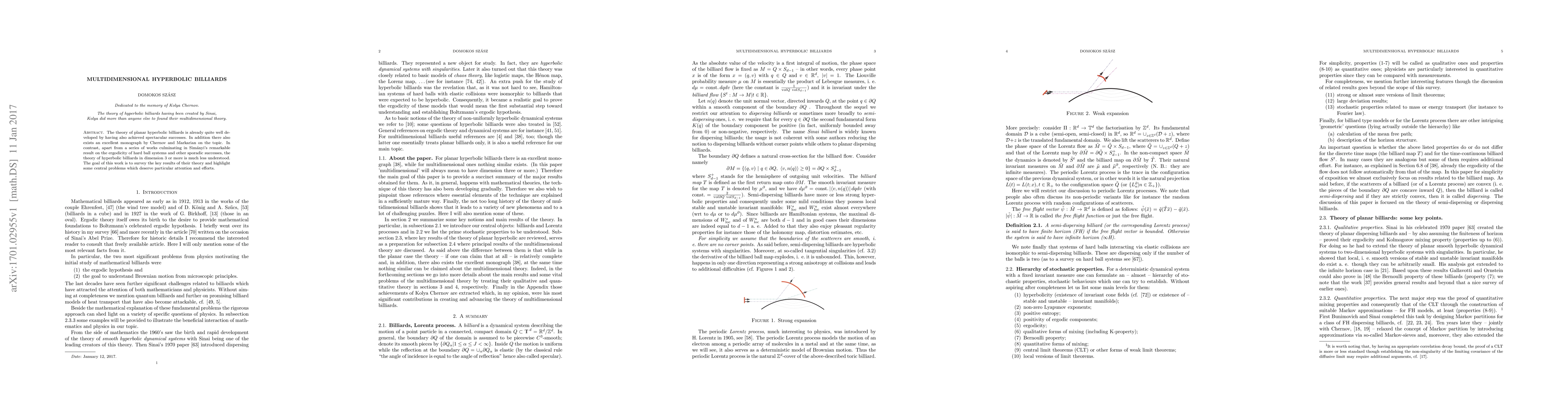 This paper surveys the theory of hyperbolic billiards in dimensions three or higher, highlighting key results and identifying central problems that require further research, contrasting the well-developed planar case with the less understood higher-dimensional scenarios.