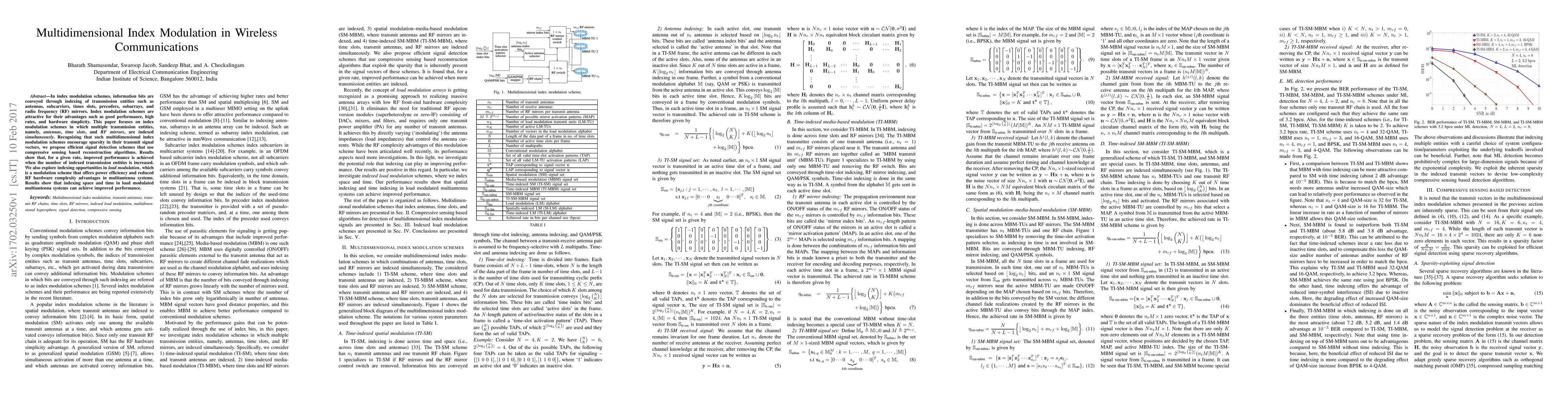 This paper explores multidimensional index modulation in wireless communications, leveraging simultaneous indexing of multiple transmission entities to enhance performance. It proposes compressive sensing-based detection schemes and demonstrates improved performance through increased indexing, also exploring load modulation for power efficiency.
