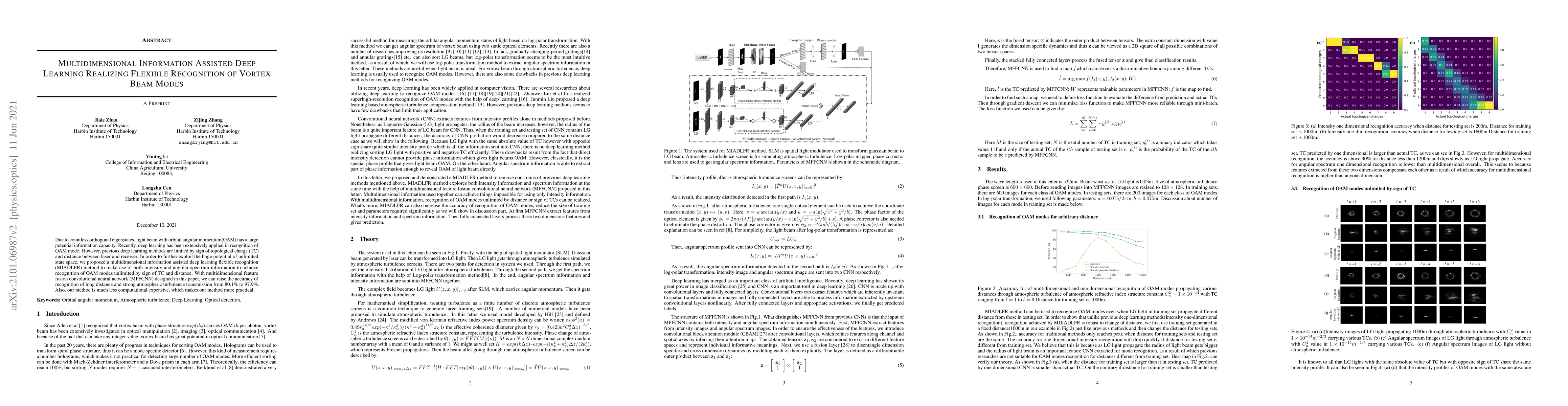 Because of the unlimited range of state space, orbital angular momentum (OAM) as a new degree of freedom of light has attracted great attention in optical communication field. Recently there are a number of researches applying deep learning on recognition of OAM modes through atmospheric turbulence. However, there are several limitations in previous deep learning recognition methods. They all require a constant distance between the laser and receiver, which makes them clumsy and not practical. As far as we know, previous deep learning methods cannot sort vortex beams with positive and negative topological charges, which can reduce information capacity. A Multidimensional Information Assisted Deep Learning Flexible Recognition (MIADLFR) method is proposed in this letter. In MIADLR we utilize not only the intensity profile, also spectrum information to recognize OAM modes unlimited by distance and sign of topological charge (TC). As far as we know, we first make use of multidimensional information to recognize OAM modes and we first utilize spectrum information to recognize OAM modes. Recognition of OAM modes unlimited by distance and sign of TC achieved by MIADLFR method can make optical communication and detection by OAM light much more attractive.