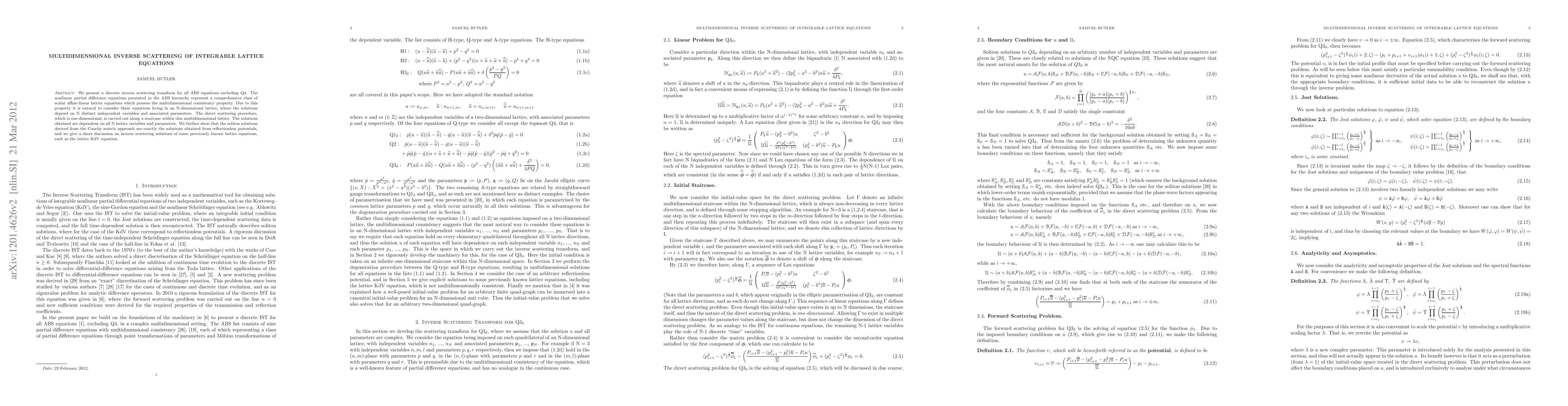 The research presents a discrete inverse scattering transform for integrable lattice equations, focusing on the ABS hierarchy excluding Q4. The method involves a multidimensional staircase within an N-dimensional lattice, with solutions dependent on N independent variables and associated parameters.