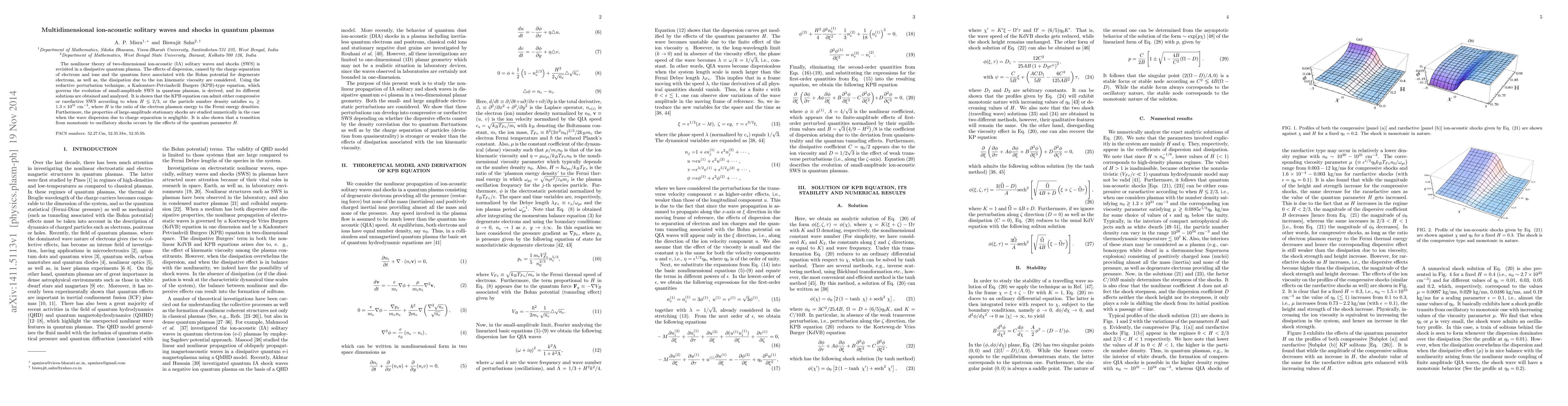 This paper revisits the nonlinear theory of two-dimensional ion-acoustic solitary waves and shocks in quantum plasmas, deriving a Kadomtsev-Petviashvili Burgers-type equation to describe their evolution. It shows that the equation can admit either compressive or rarefactive shocks depending on the quantum parameter $H$ and electron density.