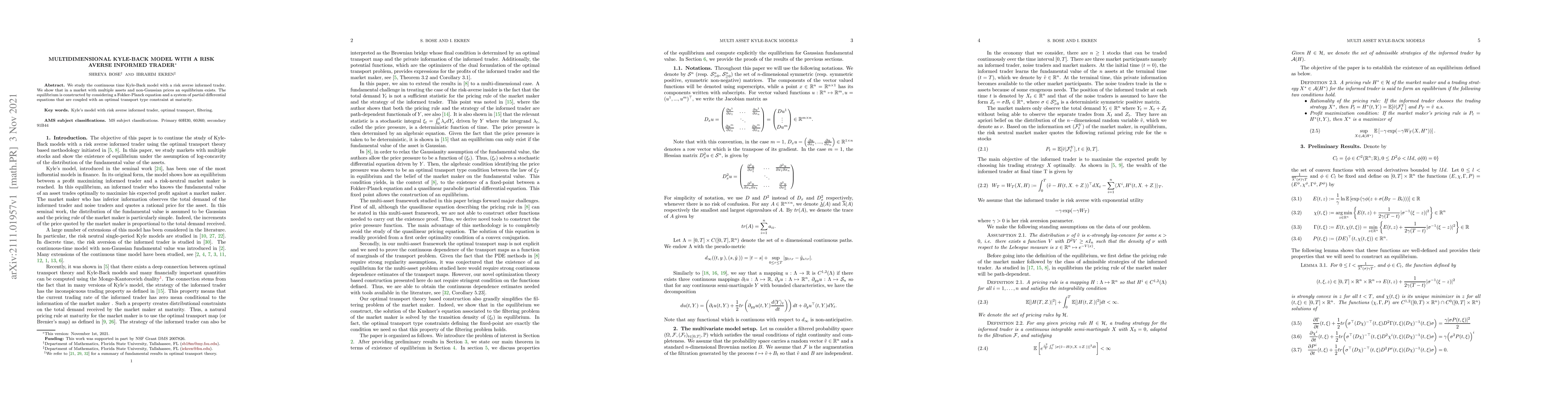 This paper extends the Kyle-Back model to include a risk-averse informed trader in a multi-asset market with non-Gaussian prices, demonstrating the existence of equilibrium through a Fokker-Planck equation and coupled partial differential equations with an optimal transport constraint.