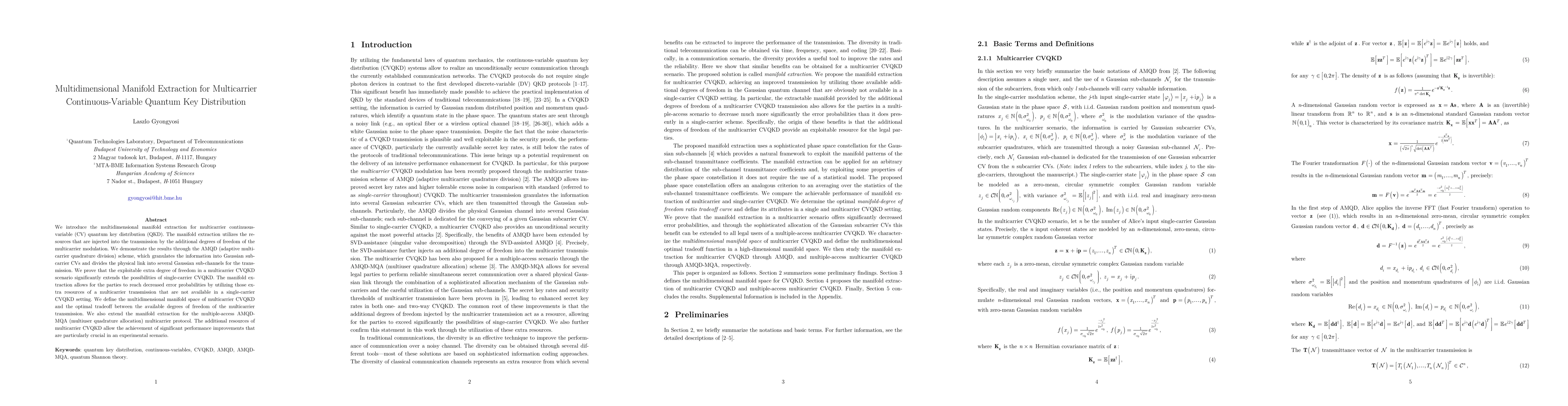 This paper introduces a multidimensional manifold extraction technique for multicarrier continuous-variable quantum key distribution (CVQKD), leveraging the additional degrees of freedom in multicarrier modulation to enhance security and reduce error rates. The AMQD scheme is used to demonstrate significant performance improvements over single-carrier CVQKD, particularly in experimental settings.