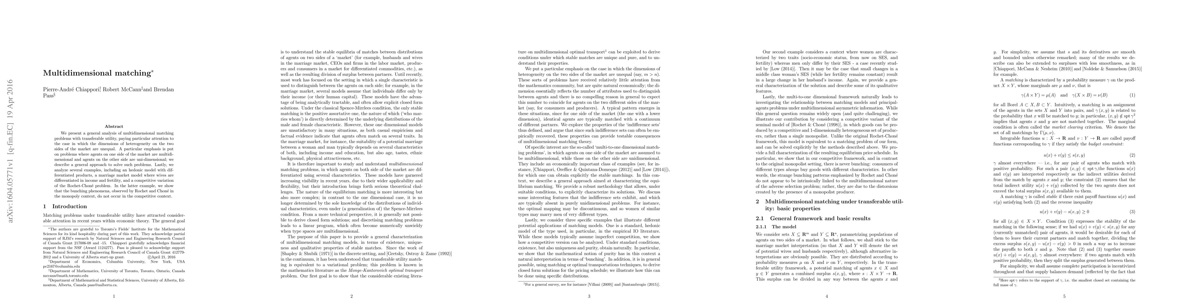 We present a general analysis of multidimensional matching problems with transferable utility, paying particular attention to the case in which the dimensions of heterogeneity on the two sides of the market are unequal. A particular emphasis is put on problems where agents on one side of the market are multidimensional and agents on the other side are uni-dimensional, we describe a general approach to solve such problems. Lastly, we analyze several examples, including an hedonic model with differentiated products, a marriage market model where wives are differentiated in income and fertility, and a competitive variation of the Rochet-Chon\'e problem. In the latter example, we show that the bunching phenomena, observed by Rochet and Chon\'e in the monopoly context, do not occur in the competitive context