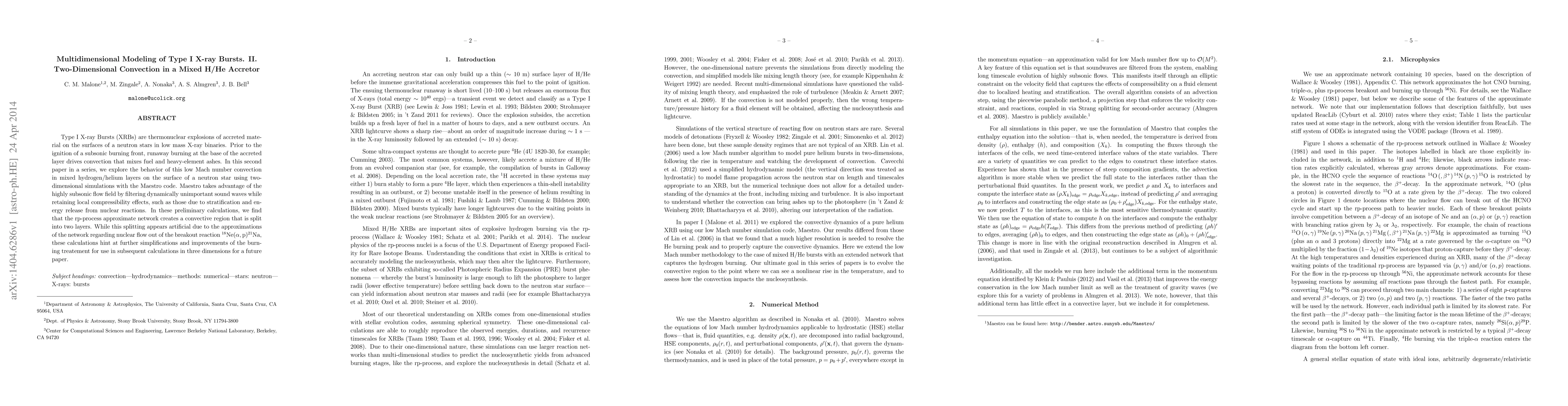 Type I X-ray Bursts (XRBs) are thermonuclear explosions of accreted material on the surfaces of a neutron stars in low mass X-ray binaries. Prior to the ignition of a subsonic burning front, runaway burning at the base of the accreted layer drives convection that mixes fuel and heavy-element ashes. In this second paper in a series, we explore the behavior of this low Mach number convection in mixed hydrogen/helium layers on the surface of a neutron star using two-dimensional simulations with the Maestro code. Maestro takes advantage of the highly subsonic flow field by filtering dynamically unimportant sound waves while retaining local compressibility effects, such as those due to stratification and energy release from nuclear reactions. In these preliminary calculations, we find that the rp-process approximate network creates a convective region that is split into two layers. While this splitting appears artificial due to the approximations of the network regarding nuclear flow out of the breakout reaction 18Ne(a,p)21Na, these calculations hint at further simplifications and improvements of the burning treatment for use in subsequent calculations in three dimensions for a future paper.