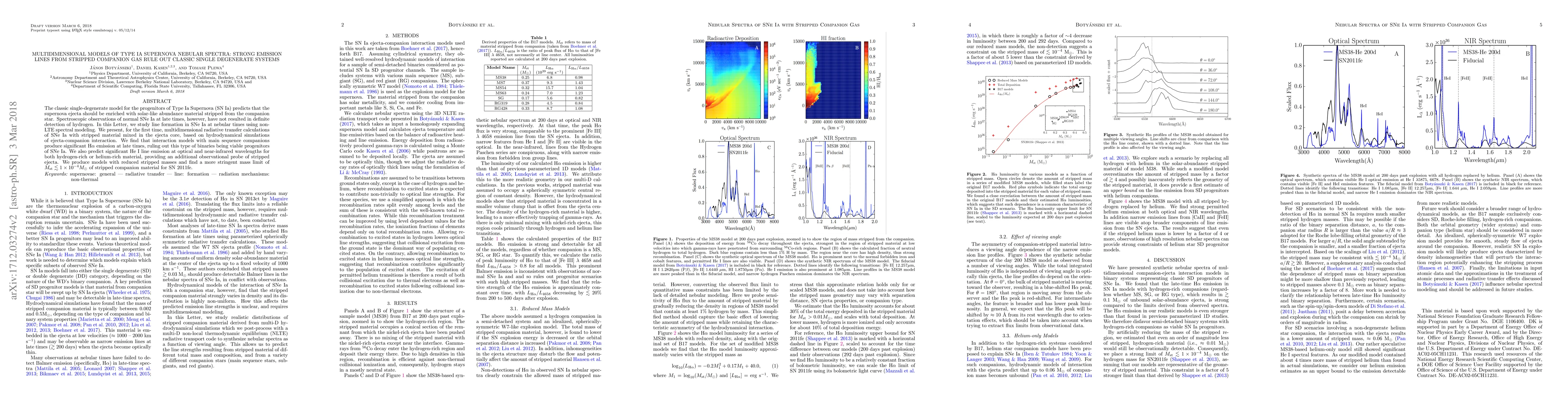 The classic single-degenerate model for the progenitors of Type Ia Supernova (SN Ia) predicts that the supernova ejecta should be enriched with solar-like abundance material stripped from the companion star. Spectroscopic observations of normal SNe Ia at late times, however, have not resulted in definite detection of hydrogen. In this Letter, we study line formation in SNe Ia at nebular times using non-LTE spectral modeling. We present, for the first time, multidimensional radiative transfer calculations of SNe Ia with stripped material mixed in the ejecta core, based on hydrodynamical simulations of ejecta-companion interaction. We find that interaction models with main sequence companions produce significant H$\alpha$ emission at late times, ruling out this type of binaries being viable progenitors of SNe Ia. We also predict significant He I line emission at optical and near-infrared wavelengths for both hydrogen-rich or helium-rich material, providing an additional observational probe of stripped ejecta. We produce models with reduced stripped masses and find a more stringent mass limit of $M_{st} \lesssim 1\times 10^{-4} M_\odot$ of stripped companion material for SN 2011fe.