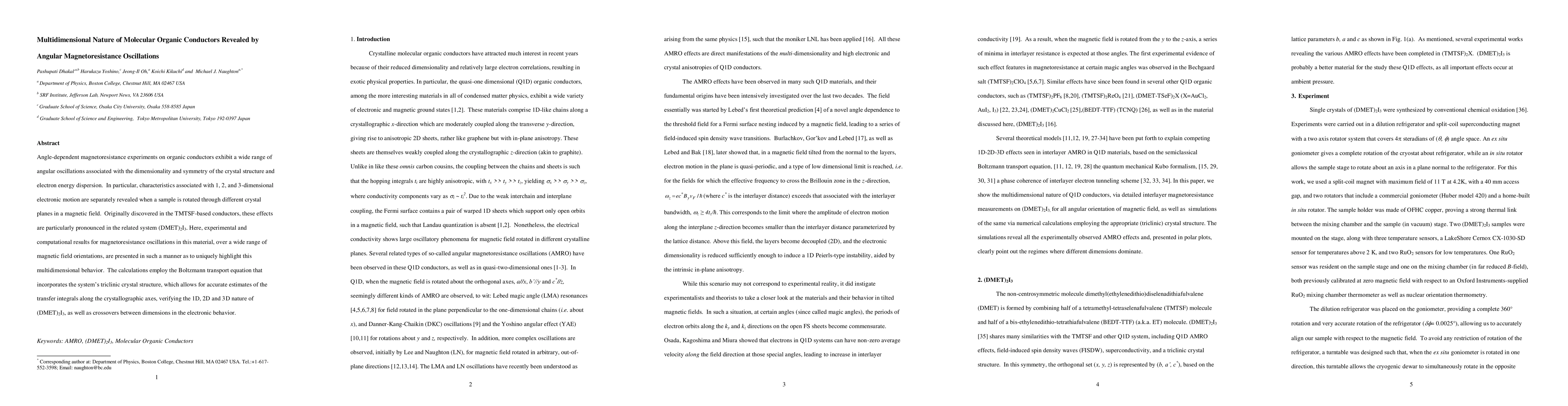 This study reveals the multidimensional electronic behavior of organic conductors through angular magnetoresistance oscillations, particularly in the (DMET)2I3 system. The experiments and computational models highlight distinct 1D, 2D, and 3D electronic motions as the sample orientation changes, confirming the material's complex dimensionality via Boltzmann transport equation calculations.