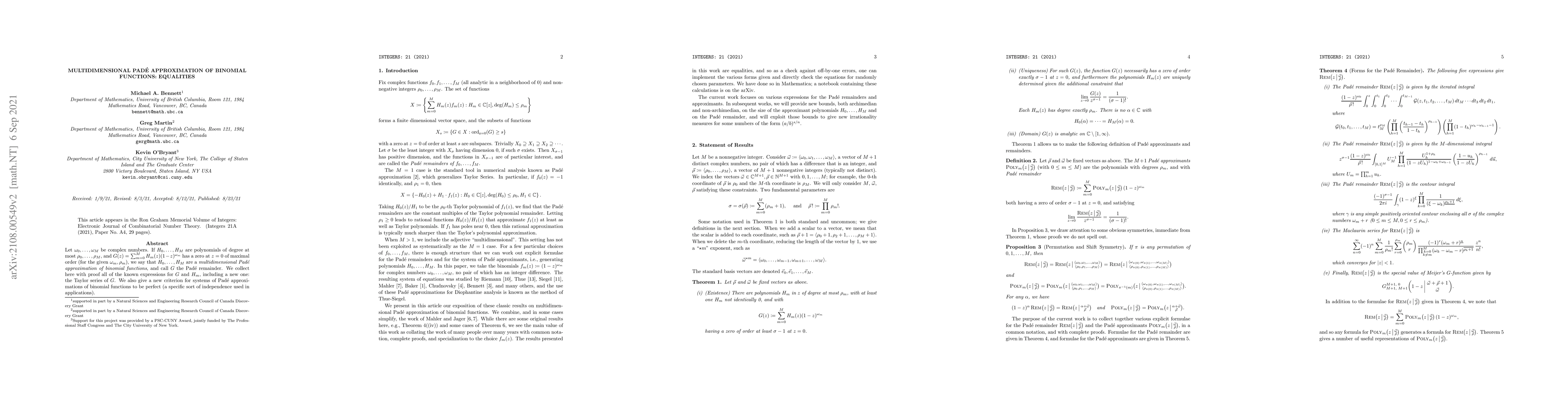 Let $\omega_0,\dots,\omega_M$ be complex numbers. If $H_0,\dots,H_M$ are polynomials of degree at most $\rho_0,\dots,\rho_M$, and $G(z)=\sum_{m=0} ^M H_m(z) (1-z)^{\omega_m}$ has a zero at $z=0$ of maximal order (for the given $\omega_m,\rho_m$), we say that $H_0,\dots,H_M$ are a \emph{multidimensional Pad\'e approximation of binomial functions}, and call $G$ the Pad\'e remainder. We collect here with proof all of the known expressions for $G$ and $H_m$, including a new one: the Taylor series of $G$. We also give a new criterion for systems of Pad\'e approximations of binomial functions to be perfect (a specific sort of independence used in applications).