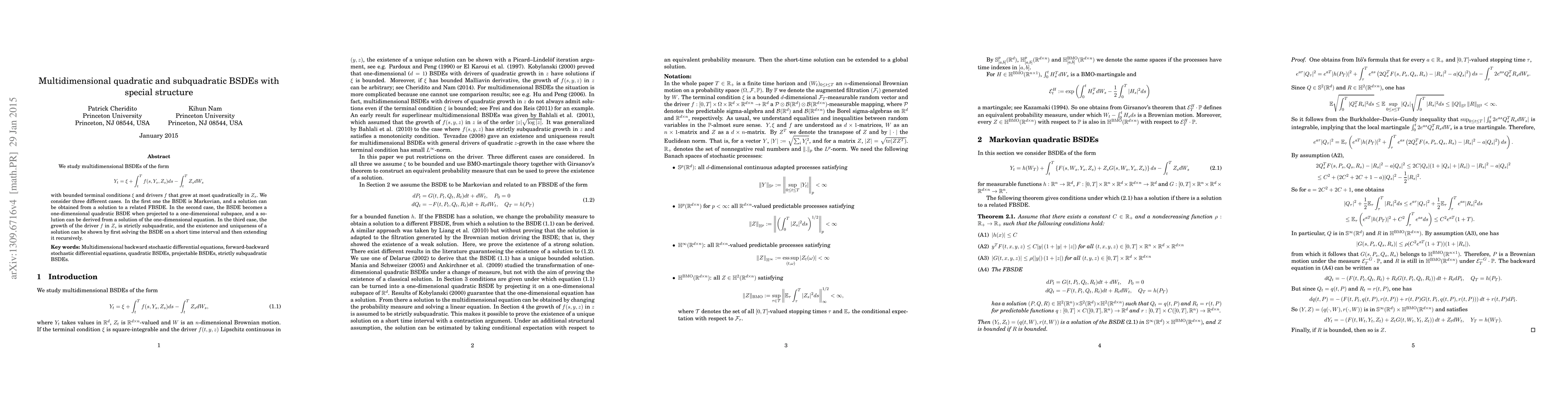 Researchers studied multidimensional BSDEs with quadratic and subquadratic drivers, finding solutions in three cases: Markovian, projected one-dimensional, and recursive extension.