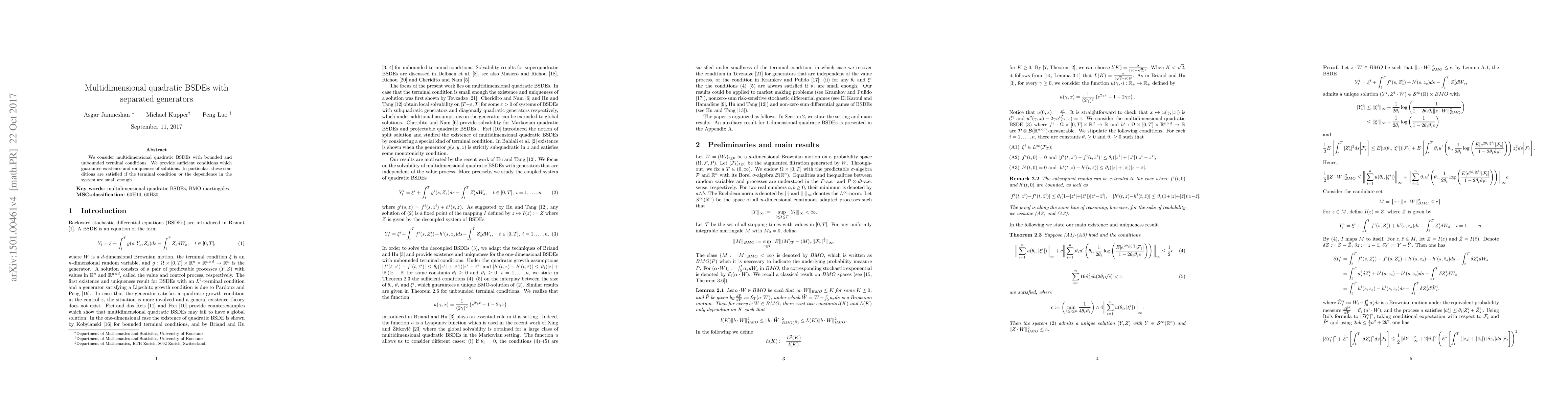 Summary: This paper investigates multidimensional quadratic BSDEs with both bounded and unbounded terminal conditions, establishing conditions for the existence and uniqueness of solutions when the terminal condition or system dependencies are sufficiently small.