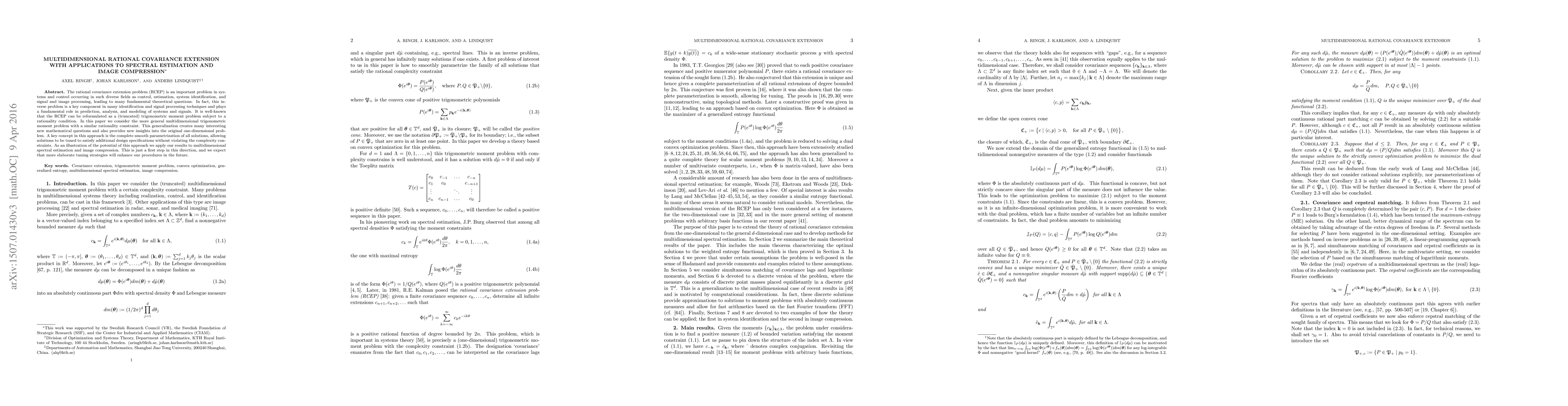 This paper explores the multidimensional rational covariance extension problem, reformulating it as a generalized trigonometric moment problem with rationality constraints. The complete smooth parametrization of solutions enables tailored design for spectral estimation and image compression, with potential for further enhancements.
