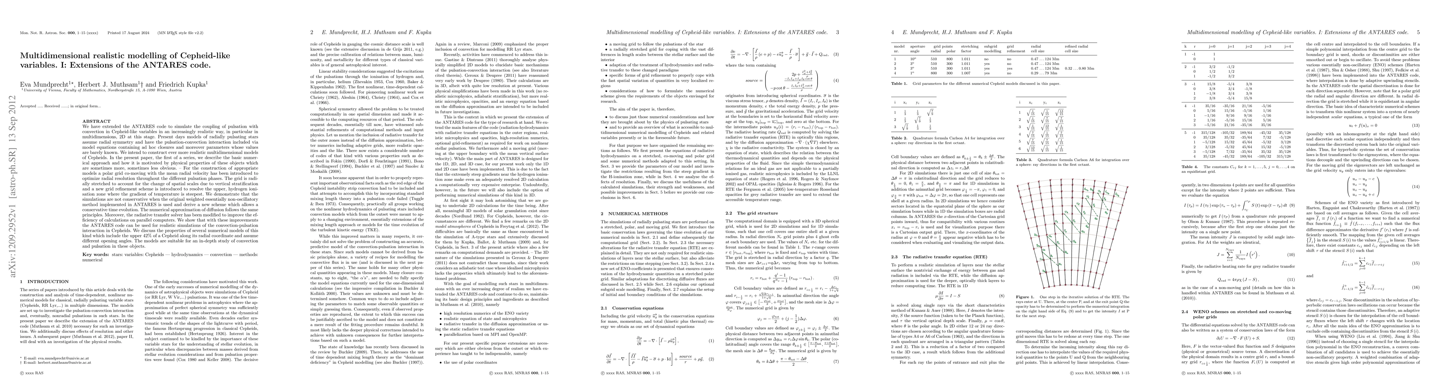 We have extended the ANTARES code to simulate the coupling of pulsation with convection in Cepheid-like variables in an increasingly realistic way, in particular in multidimensions, 2D at this stage. Present days models of radially pulsating stars assume radial symmetry and have the pulsation-convection interaction included via model equations containing ad hoc closures and moreover parameters whose values are barely known. We intend to construct ever more realistic multidimensional models of Cepheids. In the present paper, the first of a series, we describe the basic numerical approach and how it is motivated by physical properties of these objects which are sometimes more, sometimes less obvious. - For the construction of appropriate models a polar grid co-moving with the mean radial velocity has been introduced to optimize radial resolution throughout the different pulsation phases. The grid is radially stretched to account for the change of spatial scales due to vertical stratification and a new grid refinement scheme is introduced to resolve the upper, hydrogen ionisation zone where the gradient of temperature is steepest. We demonstrate that the simulations are not conservative when the original weighted essentially non-oscillatory method implemented in ANTARES is used and derive a new scheme which allows a conservative time evolution. The numerical approximation of diffusion follows the same principles. Moreover, the radiative transfer solver has been modified to improve the efficiency of calculations on parallel computers. We show that with these improvements the ANTARES code can be used for realistic simulations of the convection-pulsation interaction in Cepheids. We discuss the properties of several models which include the upper 42% of a Cepheid along its radial coordinate, assume different opening angles, and are suitable for an in-depth study of convection and pulsation.