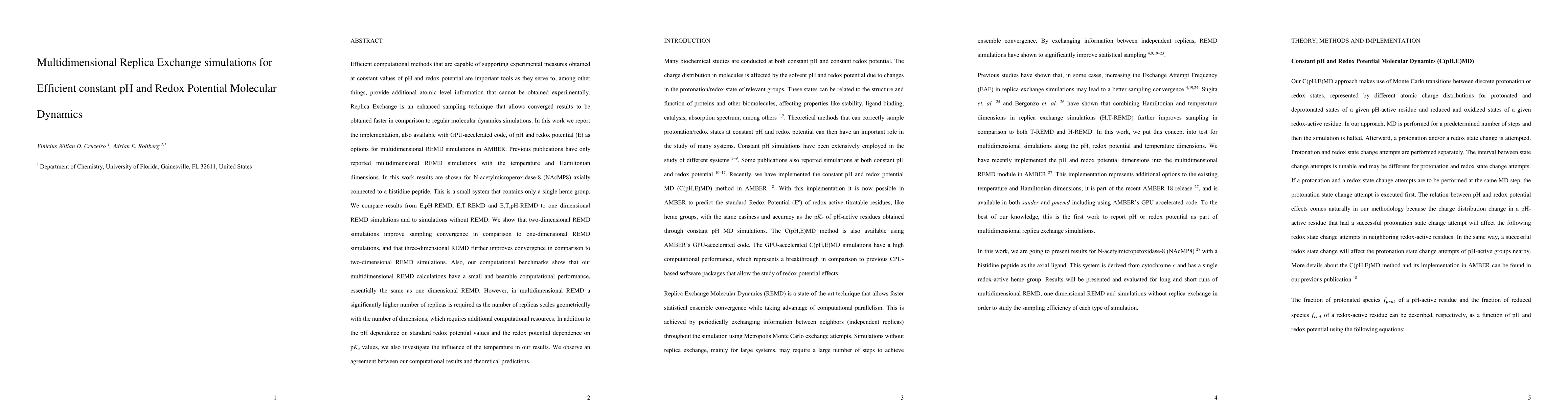 This paper introduces multidimensional Replica Exchange Molecular Dynamics (REMD) simulations for constant pH and redox potential in AMBER, demonstrating improved sampling convergence compared to 1D-REMD. The study shows that 2D-REMD and 3D-REMD significantly enhance convergence, though at the cost of increased computational resources due to the geometric scaling of replicas with dimensions.