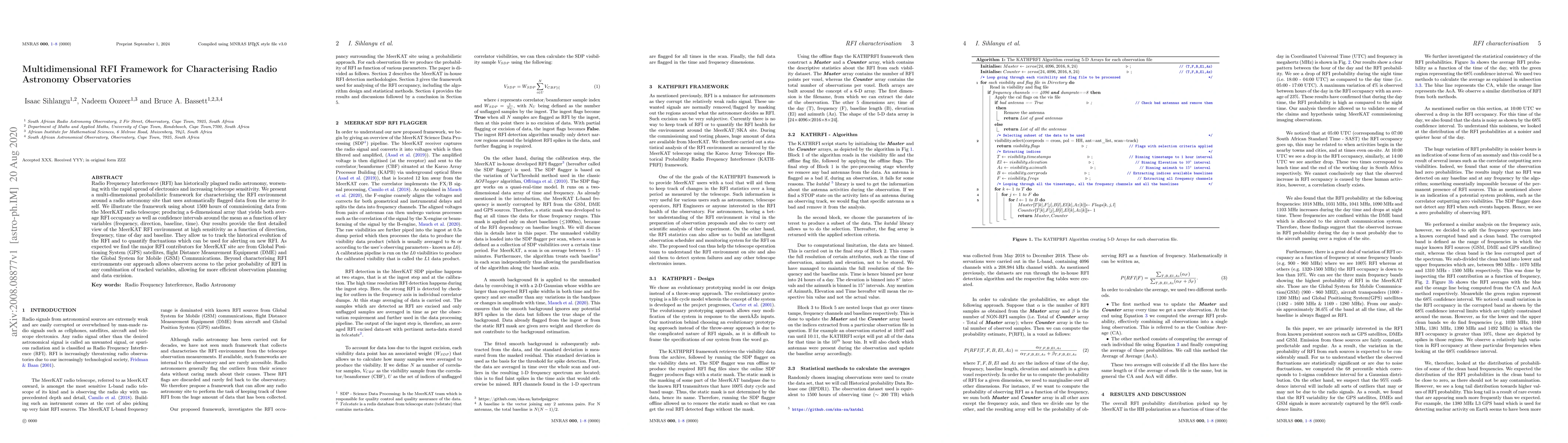 Radio Frequency Interference (RFI) has historically plagued radio astronomy, worsening with the rapid spread of electronics and increasing telescope sensitivity. We present a multi-dimensional probabilistic framework for characterising the RFI environment around a radio astronomy site that uses automatically flagged data from the array itself. We illustrate the framework using about 1500 hours of commissioning data from the MeerKAT radio telescope; producing a 6-dimensional array that yields both average RFI occupancy as well as confidence intervals around the mean as a function of key variables (frequency, direction, baseline, time). Our results provide the first detailed view of the MeerKAT RFI environment at high sensitivity as a function of direction, frequency, time of day and baseline. They allow us to track the historical evolution of the RFI and to quantify fluctuations which can be used for alerting on new RFI. As expected we find the major RFI contributors for MeerKAT site are from Global Positioning System (GPS) satellites, flight Distance Measurement Equipment (DME) and the Global System for Mobile (GSM) Communications. Beyond characterising RFI environments our approach allows observers access to the prior probability of RFI in any combination of tracked variables, allowing for more efficient observation planning and data excision.