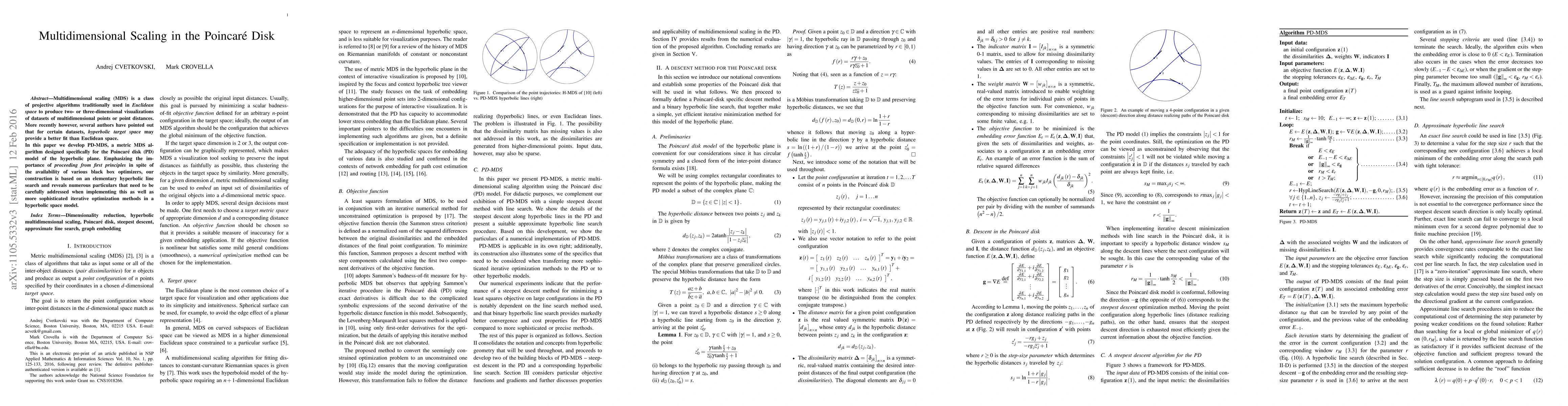 This paper introduces PD-MDS, a novel metric MDS algorithm tailored for the Poincare disk model of hyperbolic geometry, emphasizing first-principles construction over black box optimizers. It highlights unique challenges and considerations for implementing MDS in hyperbolic spaces.