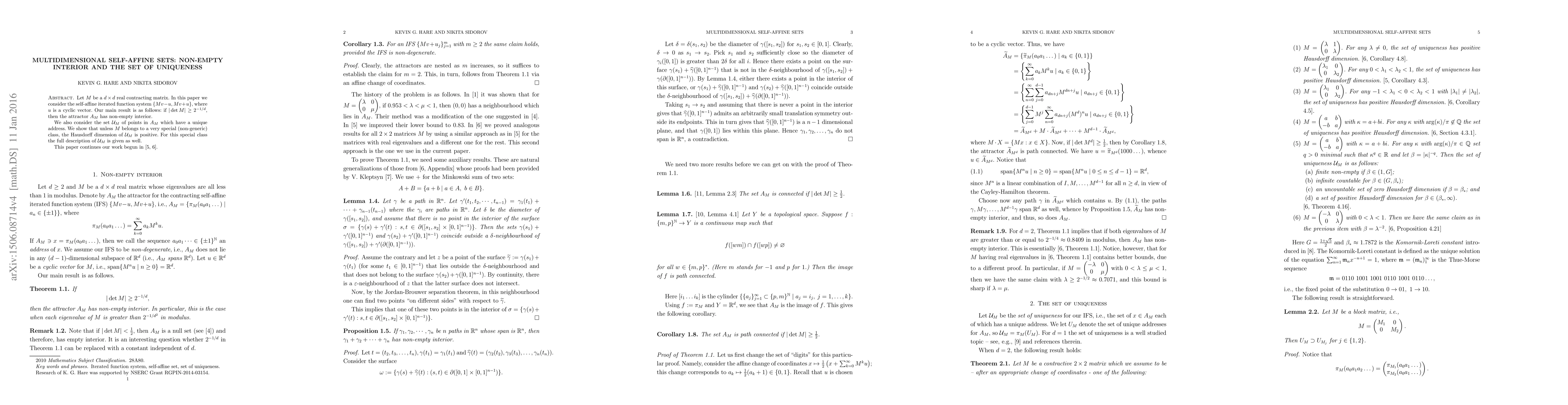 Let $M$ be a $d\times d$ contracting matrix. In this paper we consider the self-affine iterated function system $\{Mv-u, Mv+u\}$, where $u$ is a cyclic vector. Our main result is as follows: if $|\det M|\ge 2^{-1/d}$, then the attractor $A_M$ has non-empty interior. We also consider the set $\mathcal U_M$ of points in $A_M$ which have a unique address. We show that unless $M$ belongs to a very special (non-generic) class, the Hausdorff dimension of $\mathcal U_M$ is positive. For this special class the full description of $\mathcal U_M$ is given as well. This paper continues our work begun in two previous papers.