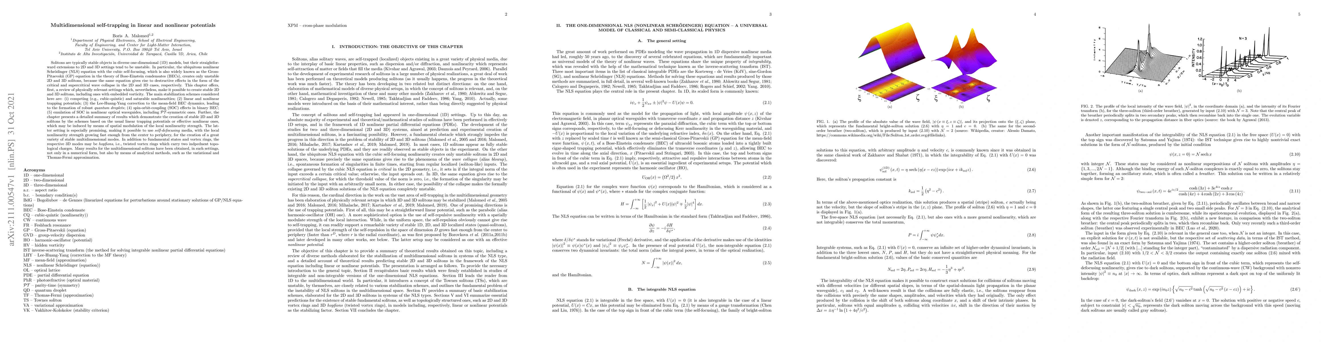 Solitons are typically stable objects in 1D models, but their straightforward extensions to 2D and 3D settings tend to be unstable. In particular, the ubiquitous nonlinear Schroedinger (NLS) equation with the cubic self-focusing, creates only unstable 2D and 3D solitons, because the same equation gives rise to the critical and supercritical collapse in the 2D and 3D cases, respectively. This article offers, first, a review of relevant settings which, nevertheless, make it possible to create stable 2D and 3D solitons, including ones with embedded vorticity. The main stabilization schemes considered here are: (i) competing (e.g., cubic-quintic) and saturable nonlinearities; (2) linear and nonlinear trapping potentials; (3) the Lee-Huang-Yang correction to the BEC dynamics, leading to the formation of robust quantum droplets; (4) spin-orbit-coupling (SOC) effects in binary BEC; (5) emulation of SOC in nonlinear optical waveguides, including PT-symmetric ones. Further, a detailed summary is presented for results which demonstrate the creation of stable 2D and 3D solitons by schemes based on the usual linear trapping potentials or effective nonlinear ones, which may be induced by means of spatial modulation of the local nonlinearity strength. The latter setting is especially promising, making it possible to use self-defocusing media, with the local nonlinearity strength growing fast enough from the center to periphery, for the creation of a great variety of stable multidimensional modes. In addition to fundamental ones and vortex rings, the 3D modes may be hopfions, i.e., twisted vortex rings with two independent topological charges. Many results for the multidimensional solitons are obtained, in such settings, not only in a numerical form, but also by means of analytical methods, such as the variational and Thomas-Fermi approximations.