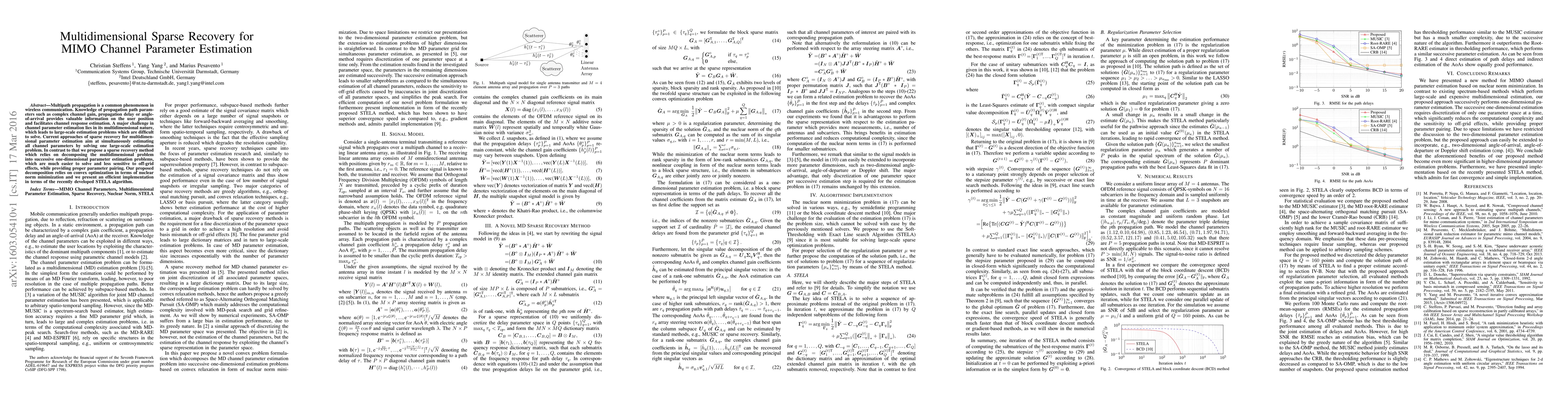 Multipath propagation is a common phenomenon in wireless communication. Knowledge of propagation path parameters such as complex channel gain, propagation delay or angle-of-arrival provides valuable information on the user position and facilitates channel response estimation. A major challenge in channel parameter estimation lies in its multidimensional nature, which leads to large-scale estimation problems which are difficult to solve. Current approaches of sparse recovery for multidimensional parameter estimation aim at simultaneously estimating all channel parameters by solving one large-scale estimation problem. In contrast to that we propose a sparse recovery method which relies on decomposing the multidimensional problem into successive one-dimensional parameter estimation problems, which are much easier to solve and less sensitive to off-grid effects, while providing proper parameter pairing. Our proposed decomposition relies on convex optimization in terms of nuclear norm minimization and we present an efficient implementation in terms of the recently developed STELA algorithm.