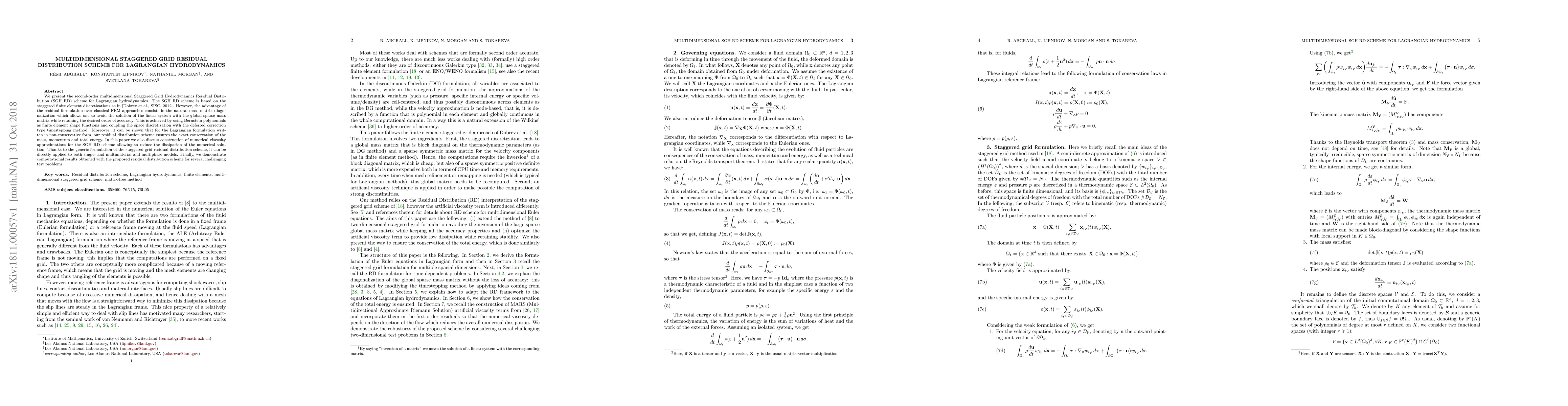 We present the second-order multidimensional Staggered Grid Hydrodynamics Residual Distribution (SGH RD) scheme for Lagrangian hydrodynamics. The SGH RD scheme is based on the staggered finite element discretizations as in [Dobrev et al., SISC, 2012]. However, the advantage of the residual formulation over classical FEM approaches consists in the natural mass matrix diagonalization which allows one to avoid the solution of the linear system with the global sparse mass matrix while retaining the desired order of accuracy. This is achieved by using Bernstein polynomials as finite element shape functions and coupling the space discretization with the deferred correction type timestepping method. Moreover, it can be shown that for the Lagrangian formulation written in non-conservative form, our residual distribution scheme ensures the exact conservation of the mass, momentum and total energy. In this paper we also discuss construction of numerical viscosity approximations for the SGH RD scheme allowing to reduce the dissipation of the numerical solution. Thanks to the generic formulation of the staggered grid residual distribution scheme, it can be directly applied to both single- and multimaterial and multiphase models. Finally, we demonstrate computational results obtained with the proposed residual distribution scheme for several challenging test problems.