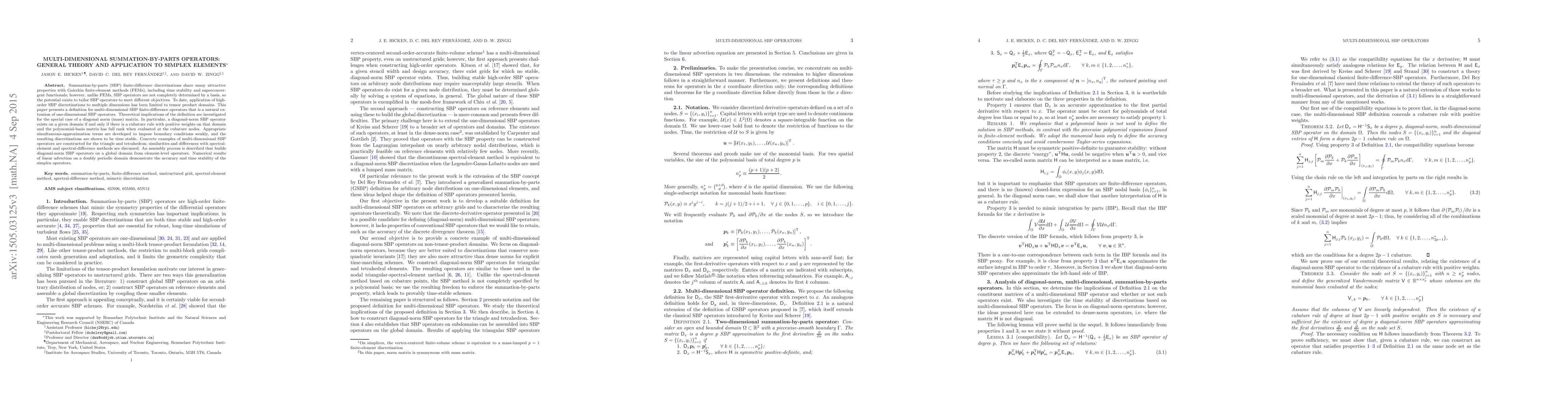 This paper extends the concept of summation-by-parts (SBP) operators to multi-dimensional simplex elements, providing a theoretical framework and practical construction for high-order SBP discretizations. It demonstrates the time stability and accuracy of these operators through numerical examples of linear advection on a doubly periodic domain.