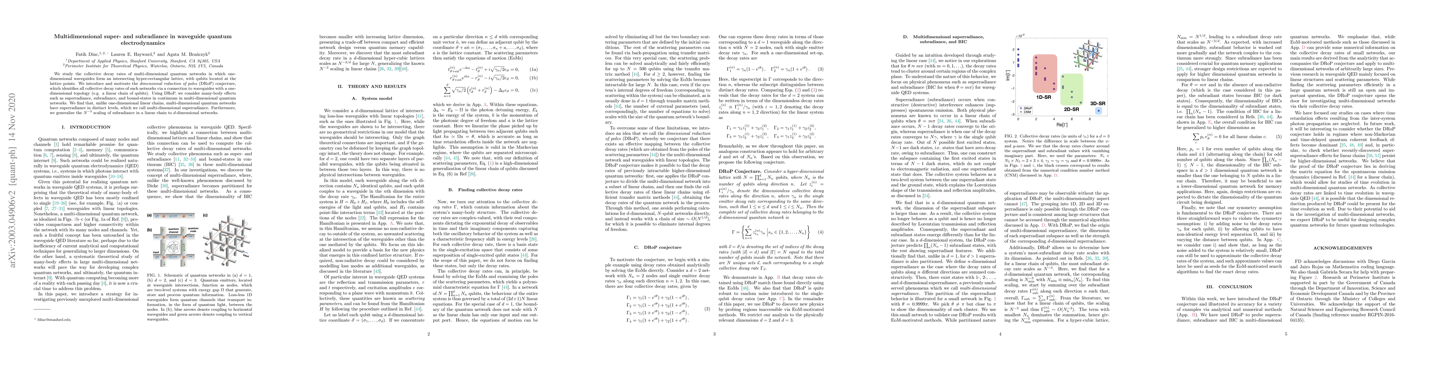 This paper investigates the collective decay rates in multi-dimensional quantum networks formed by intersecting waveguides, introducing the DRoP conjecture to link these rates to simpler one-dimensional systems. It reveals distinct multi-dimensional superradiance and generalizes the subradiance scaling from linear chains to higher dimensions.
