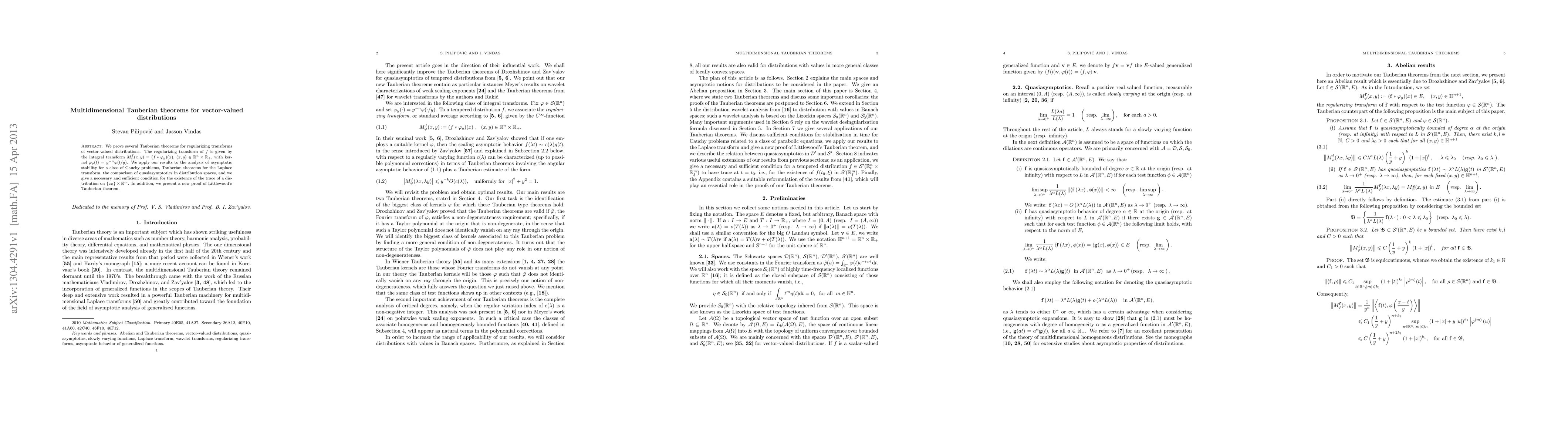 This paper proves several Tauberian theorems for vector-valued distributions using a regularizing transform, and applies these results to the analysis of asymptotic stability, Laplace transform Tauberian theorems, and quasiasymptotics in distribution spaces, along with a new proof of Littlewood's Tauberian theorem.