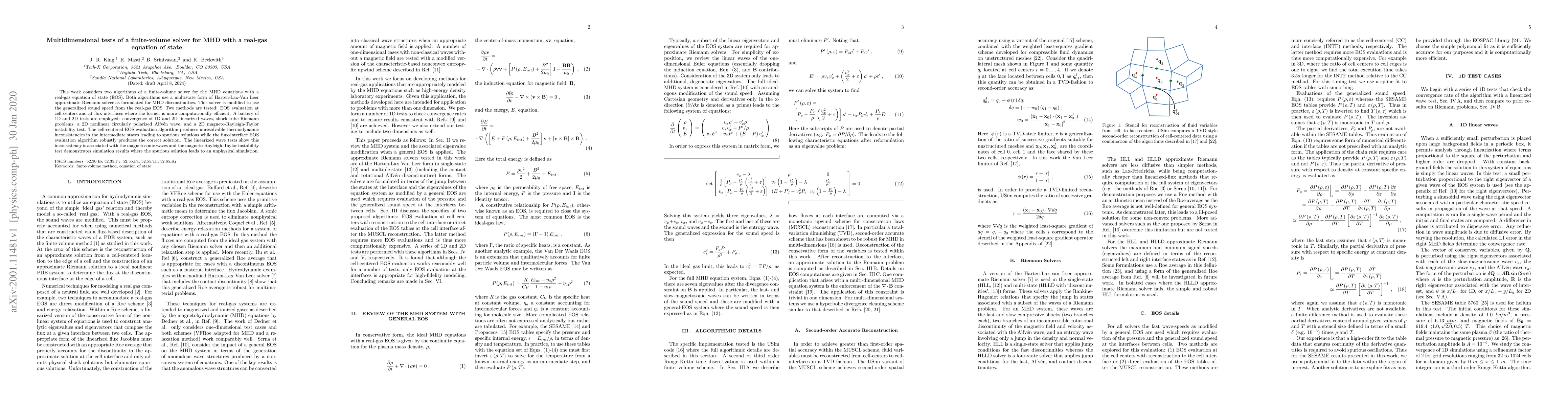 A new finite-volume solver for magnetohydrodynamics with a real-gas equation of state was tested in various 1D and 2D simulations, showing that using the EOS at flux interfaces produces accurate results while cell-centered evaluation leads to spurious solutions.