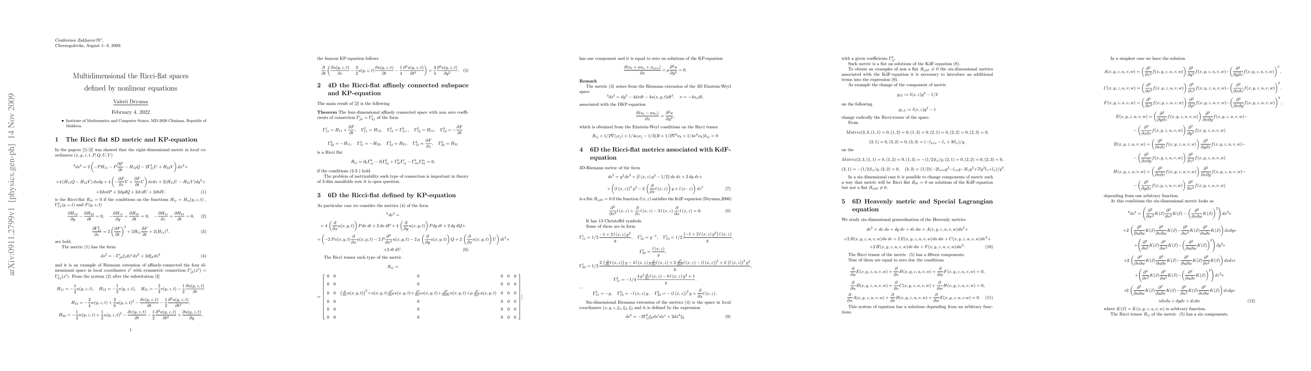 This paper constructs examples of multidimensional Ricci-flat spaces through nonlinear differential equations and examines their properties. The focus is on the geometrical and mathematical characteristics of these complex spaces.