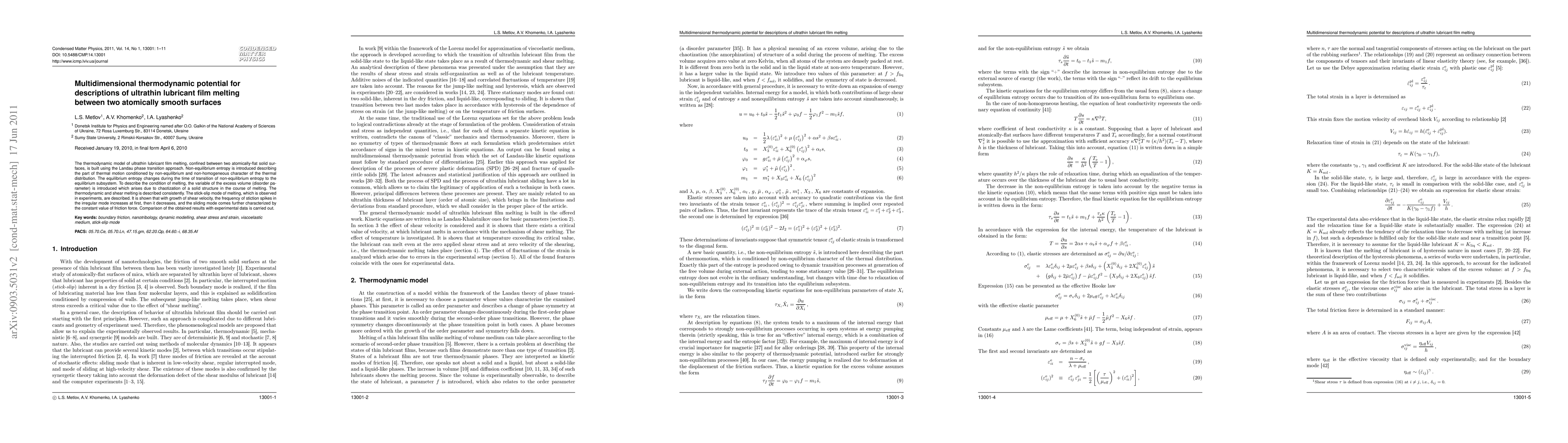 The thermodynamic model of ultrathin lubricant film melting, confined between two atomically-flat solid surfaces, is built using the Landau phase transition approach. Non-equilibrium entropy is introduced describing the part of thermal motion conditioned by non-equilibrium and non-homogeneous character of the thermal distribution. The equilibrium entropy changes during the time of transition of non-equilibrium entropy to the equilibrium subsystem. To describe the condition of melting, the variable of the excess volume (disorder parameter) is introduced which arises due to chaotization of a solid structure in the course of melting. The thermodynamic and shear melting is described consistently. The stick-slip mode of melting, which is observed in experiments, are described. It is shown that with growth of shear velocity, the frequency of stiction spikes in the irregular mode increases at first, then it decreases, and the sliding mode comes further characterized by the constant value of friction force. Comparison of the obtained results with experimental data is carried out.