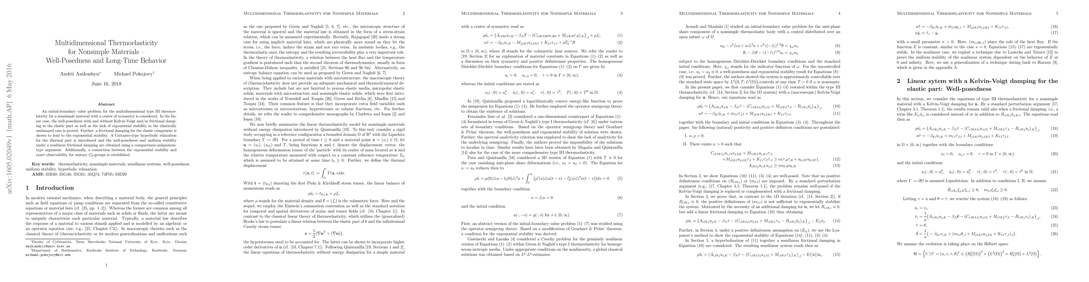 An initial-boundary value problem for the multidimensional type III thermoelaticity for a nonsimple material with a center of symmetry is considered. In the linear case, the well-posedness with and without Kelvin-Voigt and/or frictional damping in the elastic part as well as the lack of exponential stability in the elastically undamped case is proved. Further, a frictional damping for the elastic component is shown to lead to the exponential stability. A Cattaneo-type hyperbolic relaxation for the thermal part is introduced and the well-posedness and uniform stability under a nonlinear frictional damping are obtained using a compactness-uniqueness-type argument. Additionally, a connection between the exponential stability and exact observability for unitary $C_{0}$-groups is established.