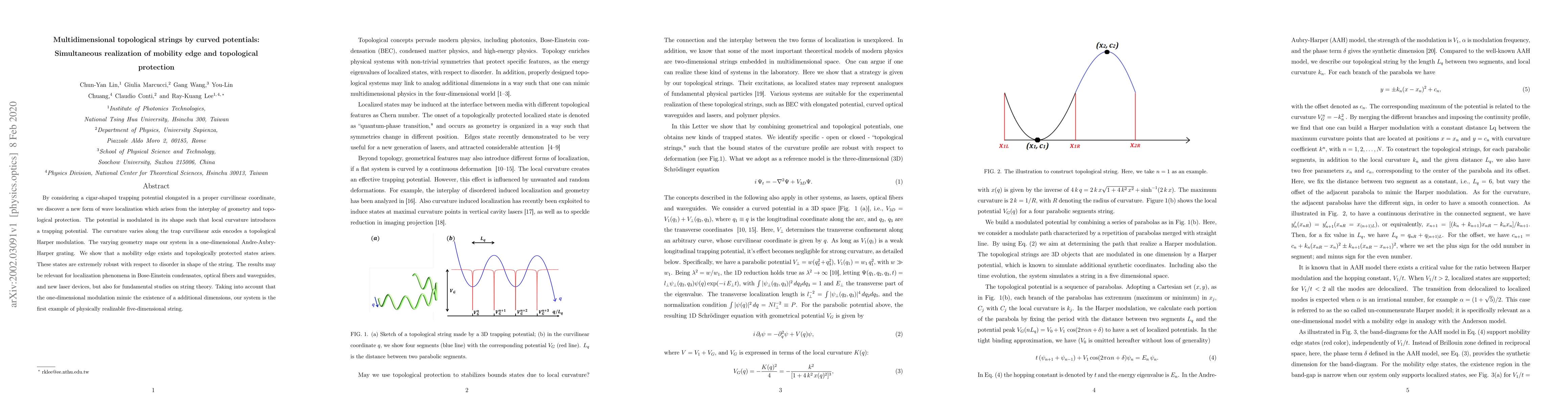 By considering a cigar-shaped trapping potential elongated in a proper curvilinear coordinate, we discover a new form of wave localization which arises from the interplay of geometry and topological protection. The potential is modulated in its shape such that local curvature introduces a trapping potential. The curvature varies along the trap curvilinear axis encodes a topological Harper modulation. The varying geometry maps our system in a one-dimensional Andre-Aubry-Harper grating. We show that a mobility edge exists and topologically protected states arises. These states are extremely robust with respect to disorder in shape of the string. The results may be relevant for localization phenomena in Bose-Einstein condensates, optical fibers and waveguides, and new laser devices, but also for fundamental studies on string theory. Taking into account that the one-dimensional modulation mimic the existence of a additional dimensions, our system is the first example of physically realizable five-dimensional string.