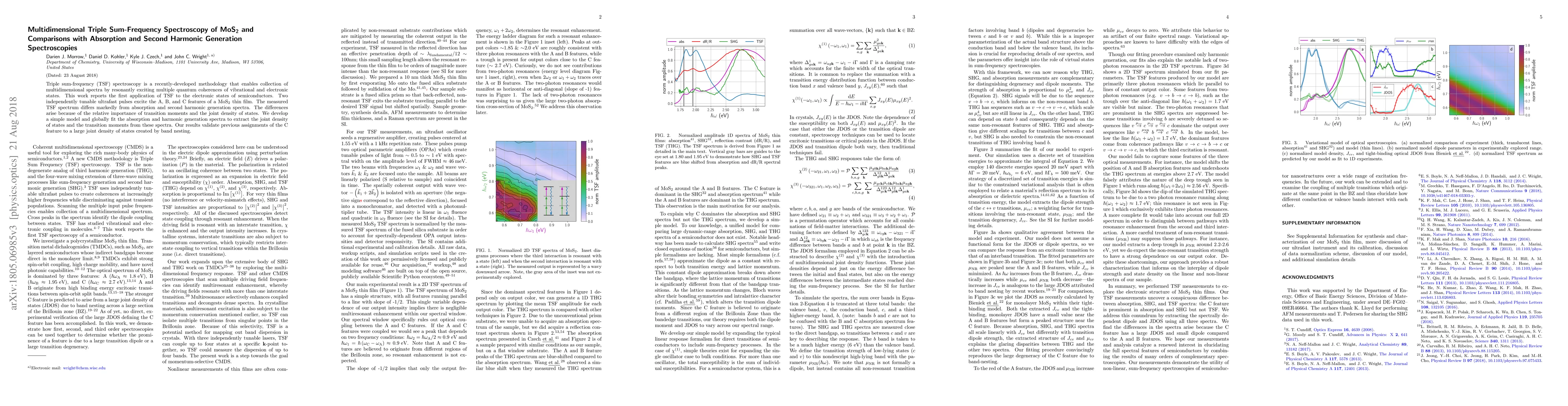This paper applies multidimensional triple sum-frequency spectroscopy (TSF) to MoS2, revealing differences from absorption and second harmonic generation spectra due to transition moments and joint density of states. The study validates the assignment of the C feature to a large joint density of states from band nesting.