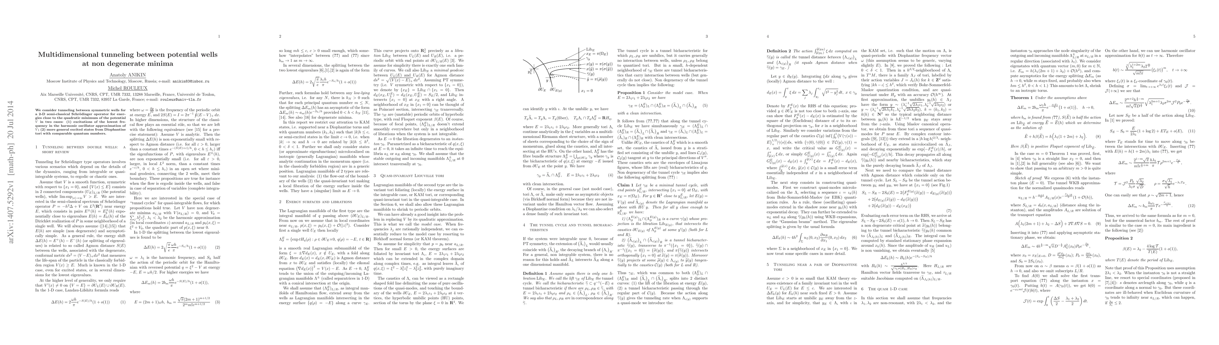 Summary: This paper investigates tunneling dynamics in a 2-D semi-classical Schrödinger system near the quadratic minimum of a symmetric potential well, examining both harmonic oscillator excitations and more complex excited states from Diophantine tori.