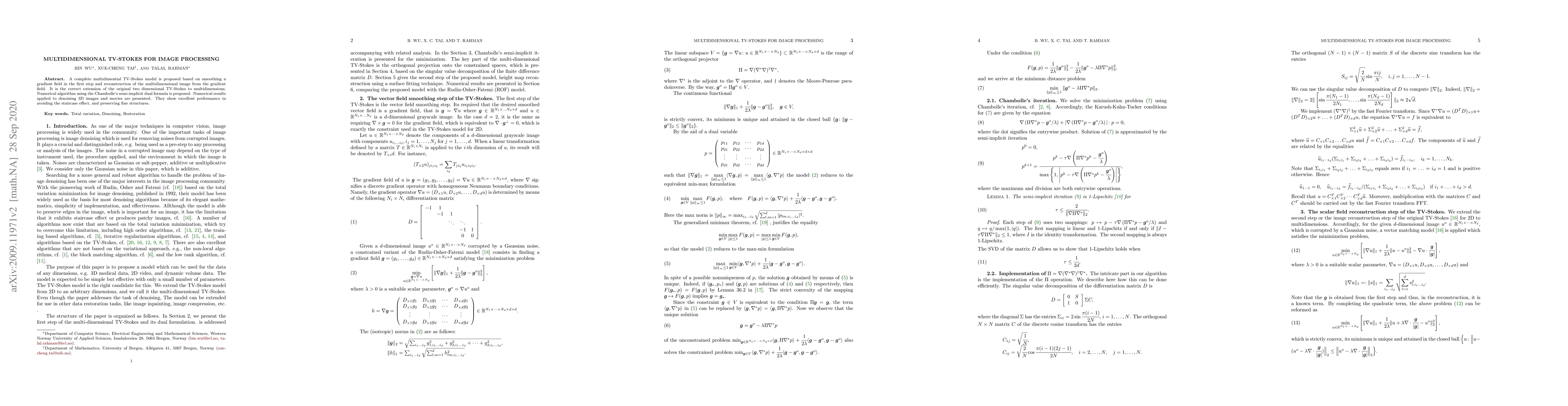 A complete multidimential TV-Stokes model is proposed based on smoothing a gradient field in the first step and reconstruction of the multidimensional image from the gradient field. It is the correct extension of the original two dimensional TV-Stokes to multidimensions. Numerical algorithm using the Chambolle's semi-implicit dual formula is proposed. Numerical results applied to denoising 3D images and movies are presented. They show excellent performance in avoiding the staircase effect, and preserving fine structures.