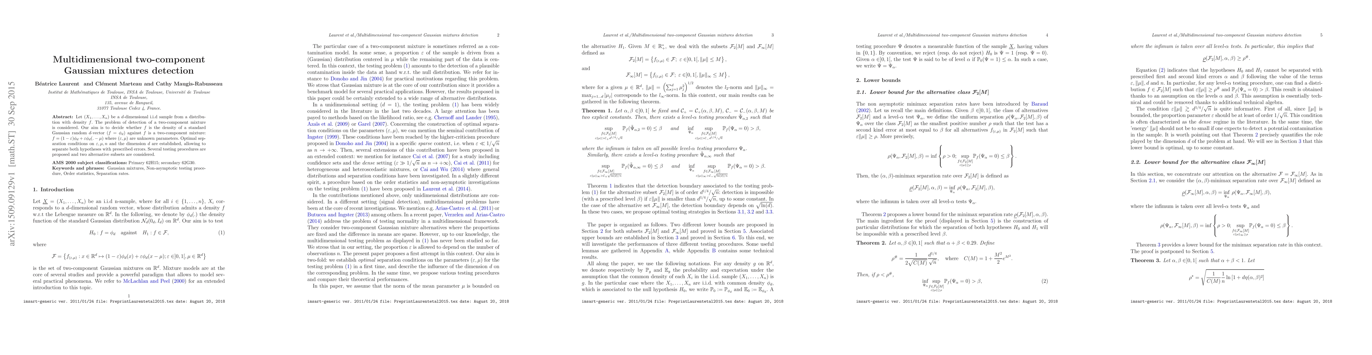 Research investigates detection of two-component Gaussian mixtures in multivariate data, aiming to distinguish between a standard Gaussian distribution and a mixture with unknown parameters. Optimal separation conditions and testing procedures are proposed to achieve prescribed errors.