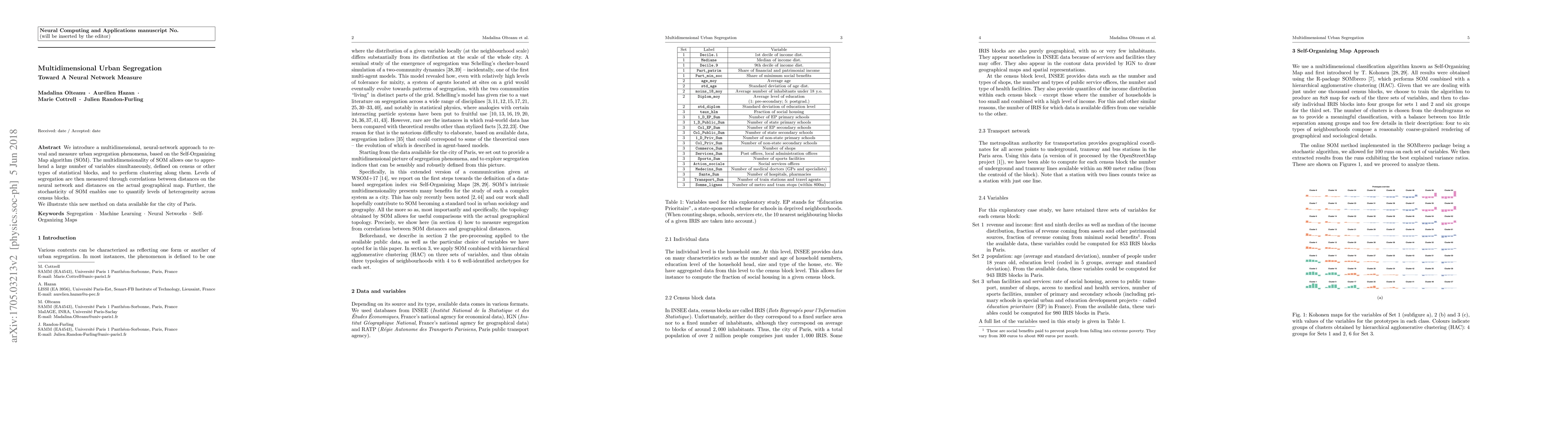 We introduce a multidimensional, neural-network approach to reveal and measure urban segregation phenomena, based on the Self-Organizing Map algorithm (SOM). The multidimensionality of SOM allows one to apprehend a large number of variables simultaneously, defined on census or other types of statistical blocks, and to perform clustering along them. Levels of segregation are then measured through correlations between distances on the neural network and distances on the actual geographical map. Further, the stochasticity of SOM enables one to quantify levels of heterogeneity across census blocks. We illustrate this new method on data available for the city of Paris.