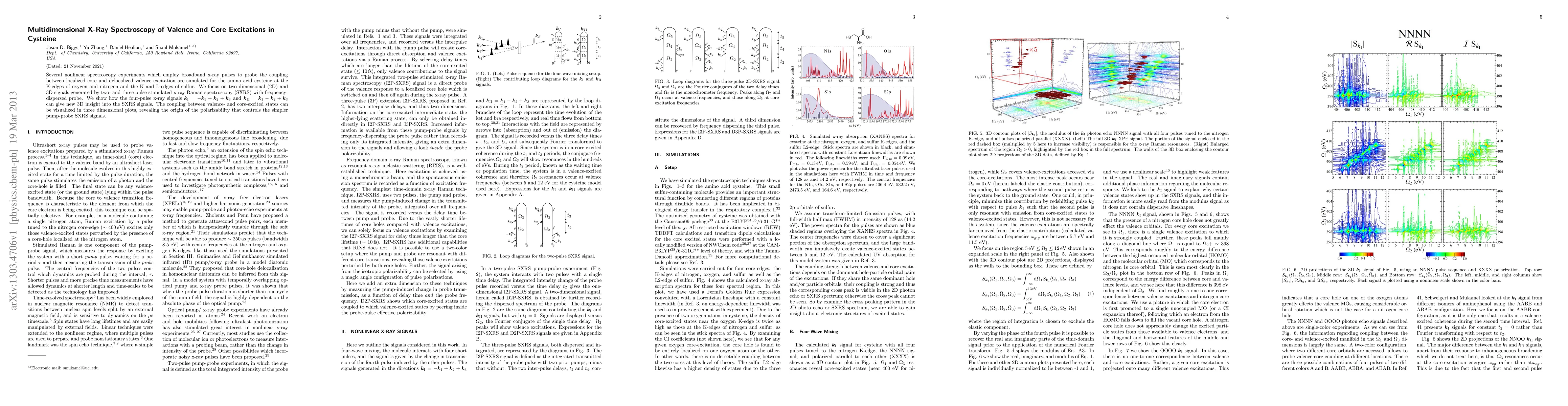 This paper investigates the multidimensional x-ray spectroscopy of cysteine, focusing on the coupling between core and valence excitations via broadband x-ray pulses. It uses 2D and 3D signals from stimulated x-ray Raman spectroscopy to provide new insights into the polarizability and the interaction between valence- and core-excited states.