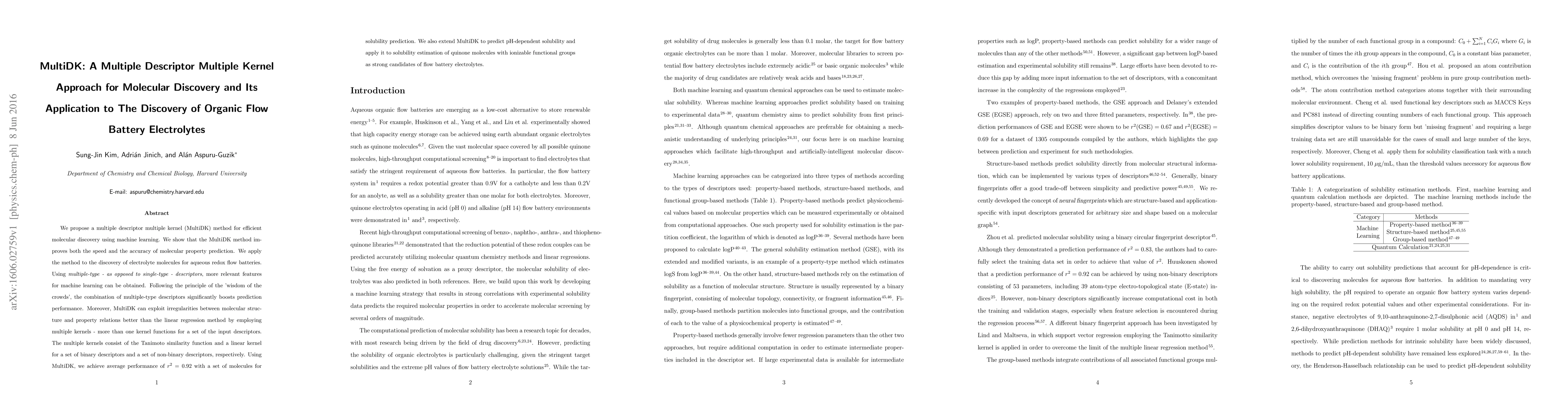We propose a multiple descriptor multiple kernel (MultiDK) method for efficient molecular discovery using machine learning. We show that the MultiDK method improves both the speed and the accuracy of molecular property prediction. We apply the method to the discovery of electrolyte molecules for aqueous redox flow batteries. Using \emph{multiple-type - as opposed to single-type - descriptors}, more relevant features for machine learning can be obtained. Following the principle of the 'wisdom of the crowds', the combination of multiple-type descriptors significantly boosts prediction performance. Moreover, MultiDK can exploit irregularities between molecular structure and property relations better than the linear regression method by employing multiple kernels - more than one kernel functions for a set of the input descriptors. The multiple kernels consist of the Tanimoto similarity function and a linear kernel for a set of binary descriptors and a set of non-binary descriptors, respectively. Using MultiDK, we achieve average performance of $r^2 = 0.92$ with a set of molecules for solubility prediction. We also extend MultiDK to predict pH-dependent solubility and apply it to solubility estimation of quinone molecules with ionizable functional groups as strong candidates of flow battery electrolytes.