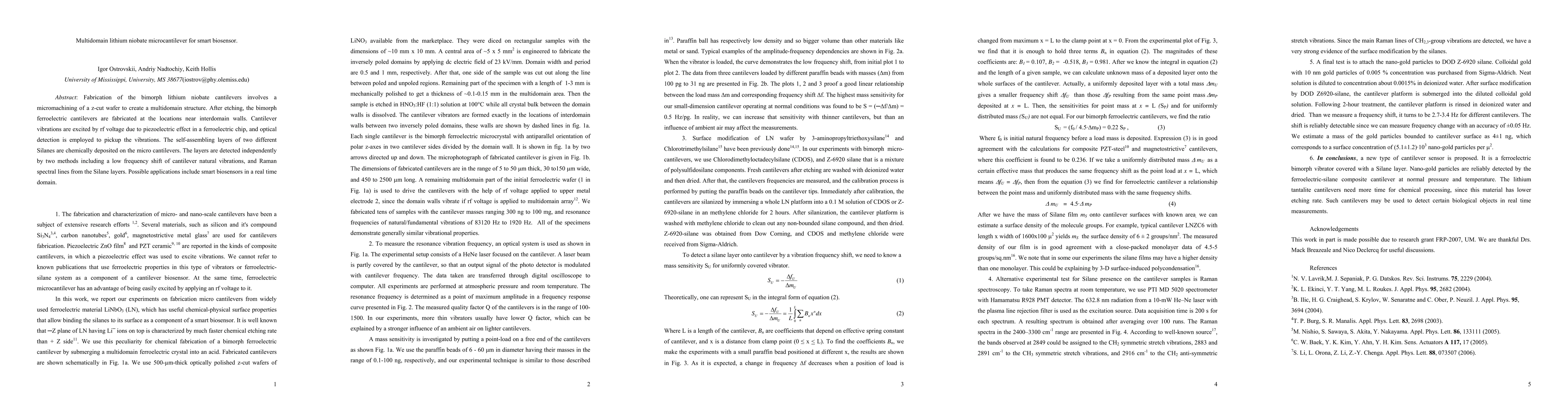 Fabrication of the bimorph lithium niobate cantilevers involves a micro machining of a z-cut wafer to create a multidomain structure. After etching, the bimorph ferroelectric cantilevers are fabricated at the locations near interdomain walls. Cantilever vibrations are excited by rf voltage due to piezoelectric effect in a ferroelectric chip, and optical detection is employed to pickup the vibrations. The self-assembling layers of two different Silanes are chemically deposited on the micro cantilevers. The layers are detected independently by two methods including a low frequency shift of cantilever natural vibrations, and Raman spectral lines from the Silane layers. Possible applications include smart biosensors in a real time domain.
