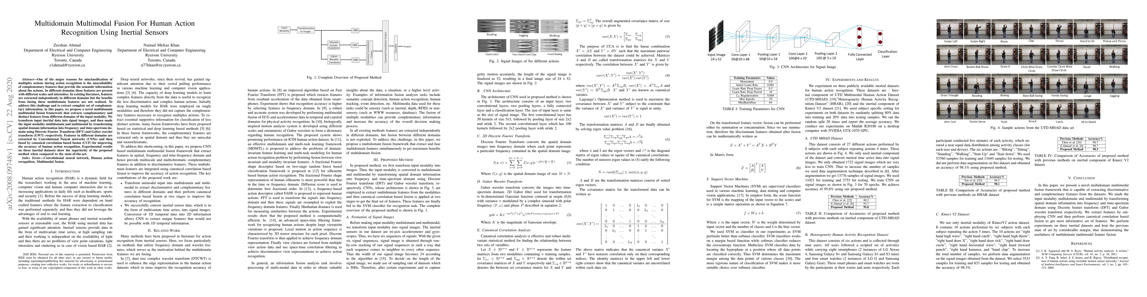 This paper proposes a novel multidomain multimodal fusion framework for human action recognition using inertial sensors, transforming input data into multiple domains to extract complementary features, which are then fused using Canonical Correlation based Fusion (CCF) to improve recognition accuracy, outperforming state-of-the-art methods on three datasets.