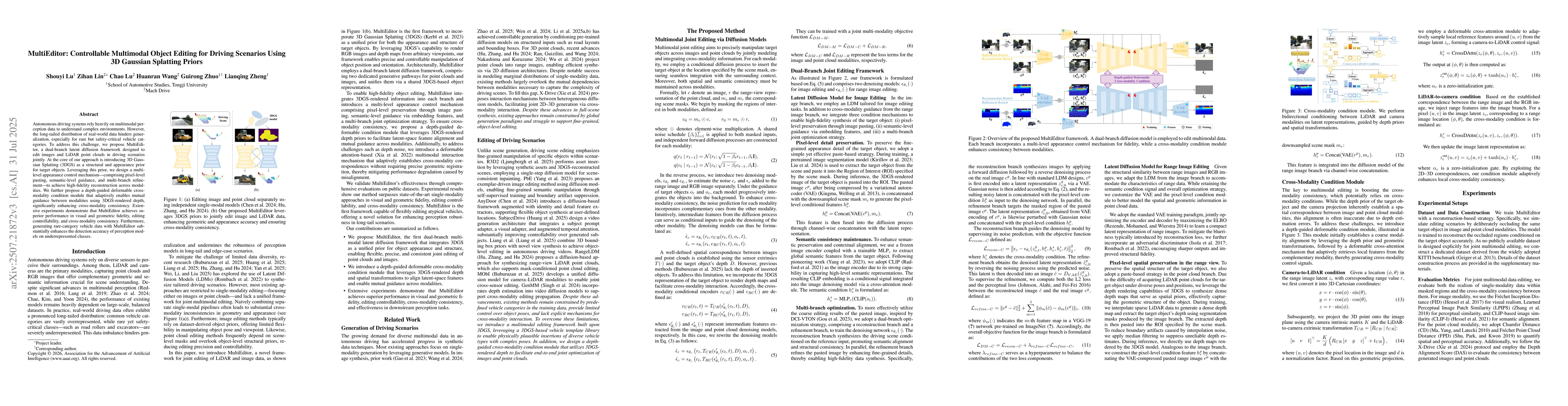 Autonomous driving systems rely heavily on multimodal perception data to understand complex environments. However, the long-tailed distribution of real-world data hinders generalization, especially for rare but safety-critical vehicle categories. To address this challenge, we propose MultiEditor, a dual-branch latent diffusion framework designed to edit images and LiDAR point clouds in driving scenarios jointly. At the core of our approach is introducing 3D Gaussian Splatting (3DGS) as a structural and appearance prior for target objects. Leveraging this prior, we design a multi-level appearance control mechanism--comprising pixel-level pasting, semantic-level guidance, and multi-branch refinement--to achieve high-fidelity reconstruction across modalities. We further propose a depth-guided deformable cross-modality condition module that adaptively enables mutual guidance between modalities using 3DGS-rendered depth, significantly enhancing cross-modality consistency. Extensive experiments demonstrate that MultiEditor achieves superior performance in visual and geometric fidelity, editing controllability, and cross-modality consistency. Furthermore, generating rare-category vehicle data with MultiEditor substantially enhances the detection accuracy of perception models on underrepresented classes.