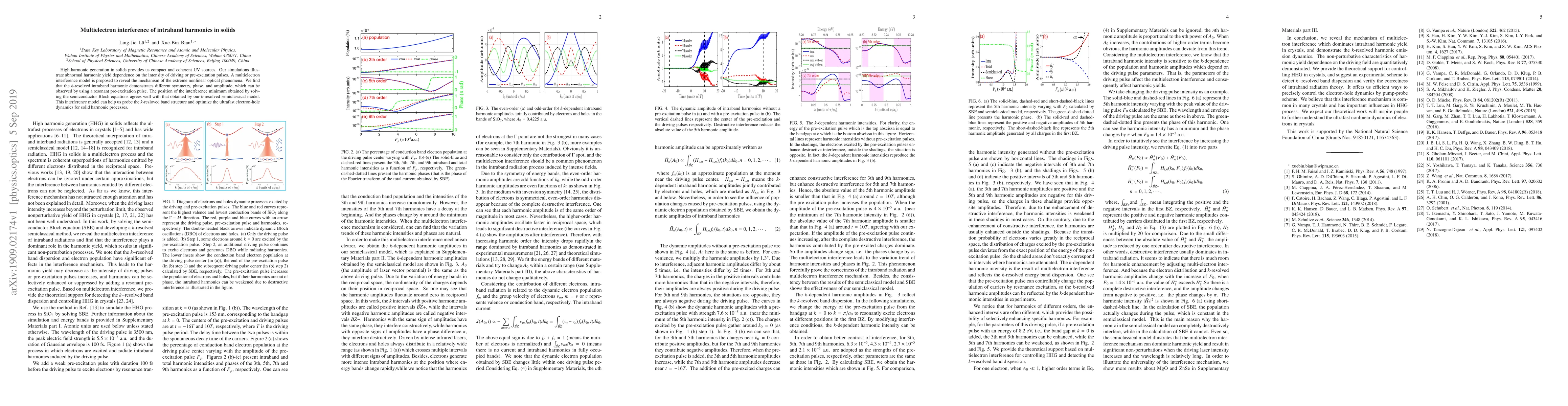 High harmonic generation in solids provides us compact and coherent UV sources. Our simulations illustrate abnormal harmonic yield dependence on the intensity of driving or pre-excitation pulses. A multielectron interference model is proposed to reveal the mechanism of the extreme nonlinear optical phenomena. We find that the $k$-resolved intraband harmonic demonstrates different symmetry, phase, and amplitude, which can be observed by using a resonant pre-excitation pulse. The position of the interference minimum obtained by solving the semiconductor Bloch equations agrees well with that obtained by our $k$-resolved semiclassical model. This interference model can help us probe the $k$-resloved band structure and optimize the ultrafast electron-hole dynamics for solid harmonic processes.